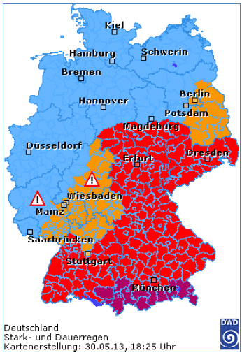 | Fig. 1.4 a): Weather alerts in Germany at the beginning of continuous heavy rain, 30 May 2013 | Fig. 1.4 b): Weather alerts in Germany at the end of continuous heavy rain, 3 June 2013 |