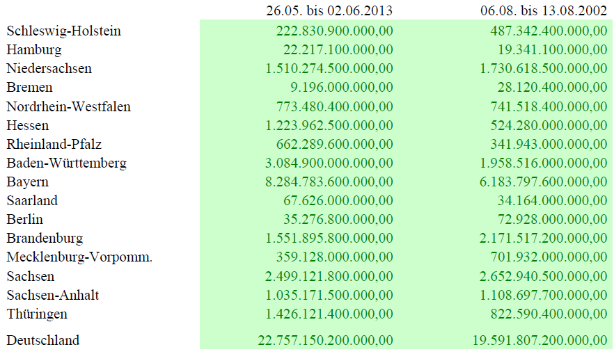 The following is a comparison of total precipitation recorded during the floods of June 2013 and August 2002. In 2002 the total for Germany was 19.5 trillion liters of water. In 2013 it was 10% more, 22.8 trillion liters of water. 22.8 trillion liters corresponds to just under half of the total water in Lake Constance, which contains 48 trillion liters. See the following table for a state-by-state breakdown of the rainfall.