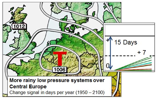 Climate simulation show, that the weather situation "Low Central Europe" will increase until the end of this century (up to 7 days more per year) in relation to the middle of the last century (Fig. 2.1).