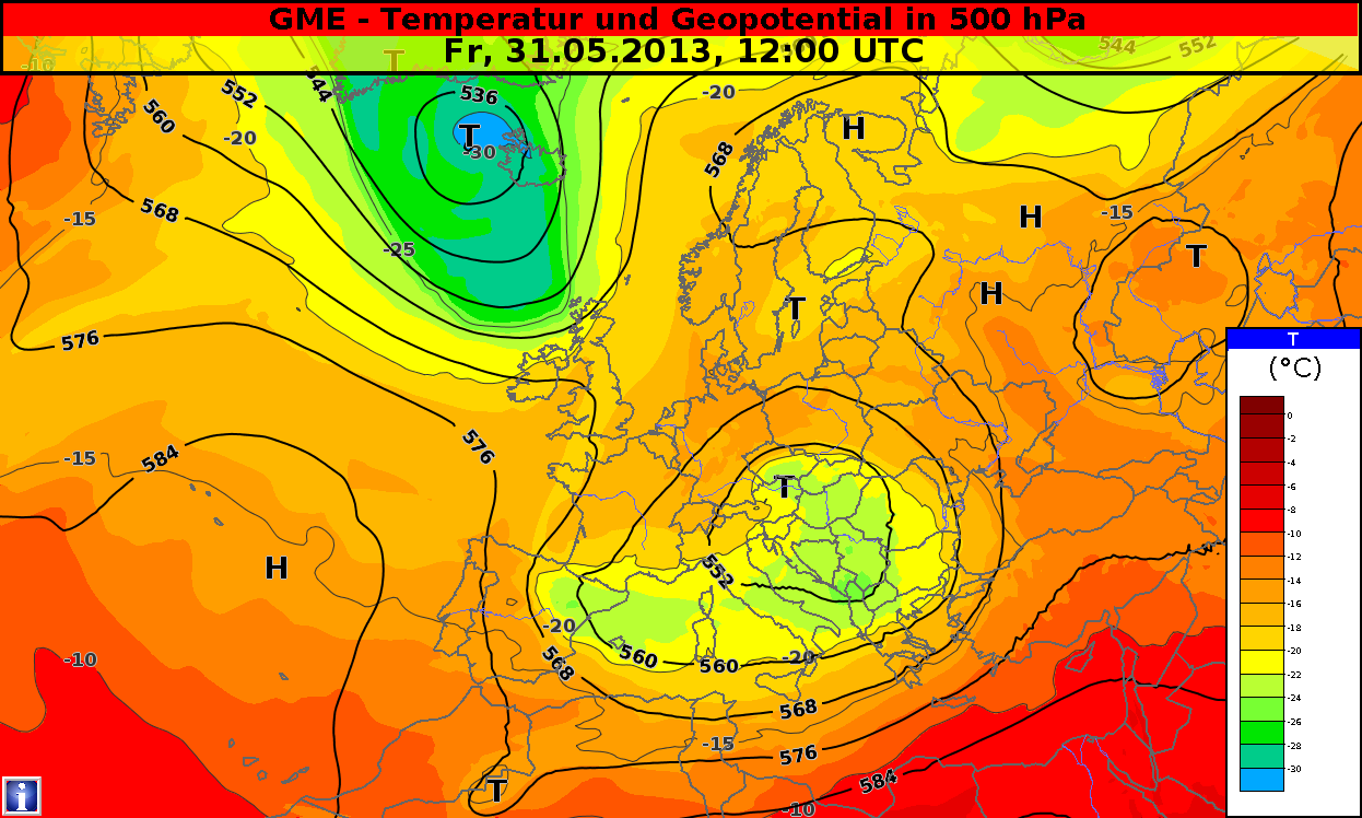 Figure 4.10: Geopotential and temperature at 500 hPa, 31 May 2013, 12 UTC. Source: DWD