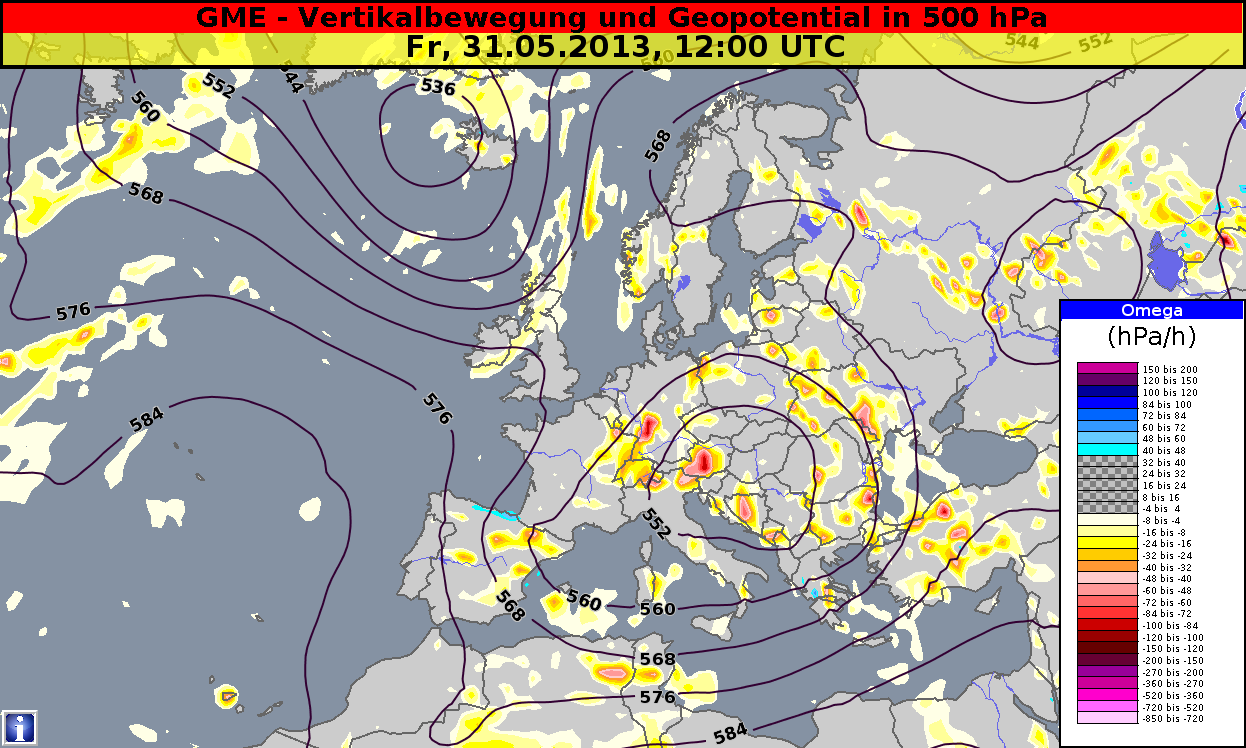 Figure 4.11: Geopotential and omega, 31 May 2013, 12 UTC. Source: DWD