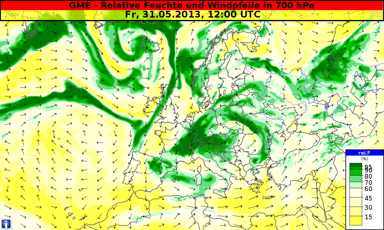 Figure 4.12: Relative humidity and wind arrows at 700 hPa, 31 May 2013, 12 UTC. Source: DWD