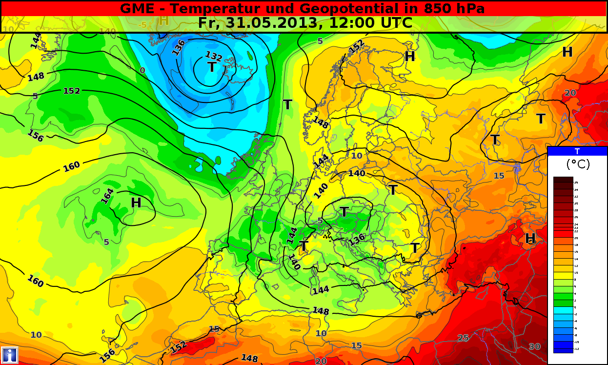 Figure 4.13: Geopotential and temperature at 850 hPa, 31 May 2013, 12 UTC. Source: DWD