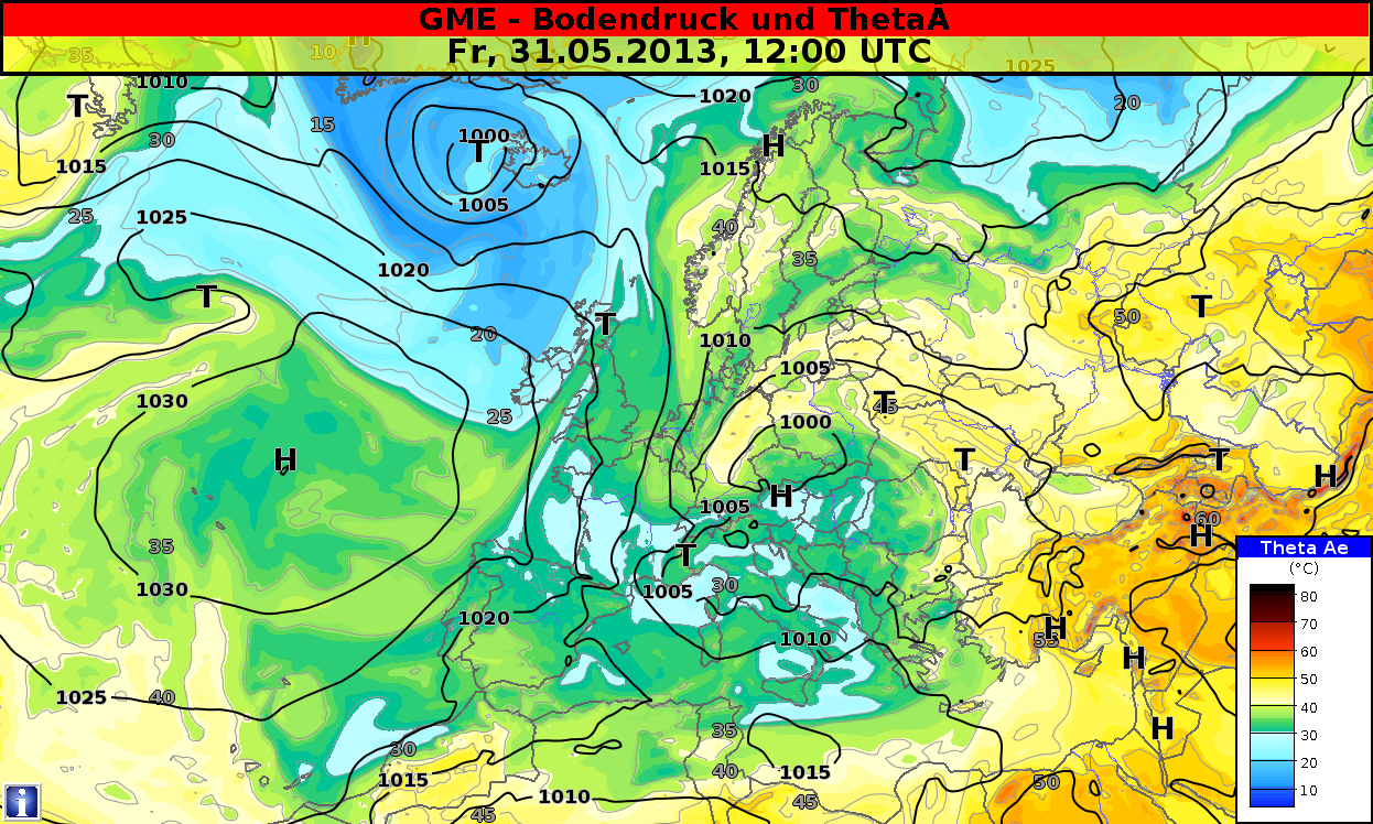 Figure 4.14: Mean sea level pressure and theta-e, 31 May 2013, 12 UTC. Source: DWD