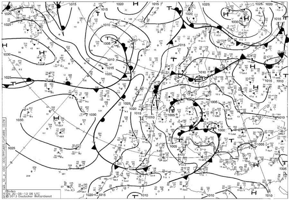 Figure 4.2: Analyses of mean sea level pressure fronts. 30 May 2013, 15:00 UTC. Source: DWD