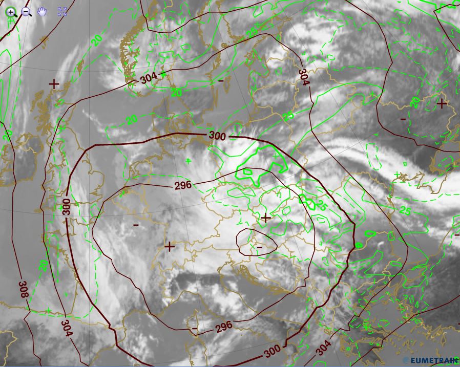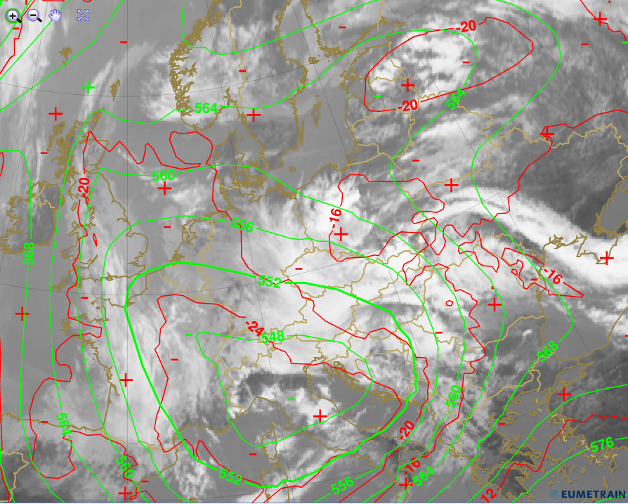 Figure 4.5: Geopotential height at 500 hPa (green) and temperature at 500 hPa (red). IR10.8, 30 May 2013, 12:00 UTC. Source: EUMeTrain, ePort