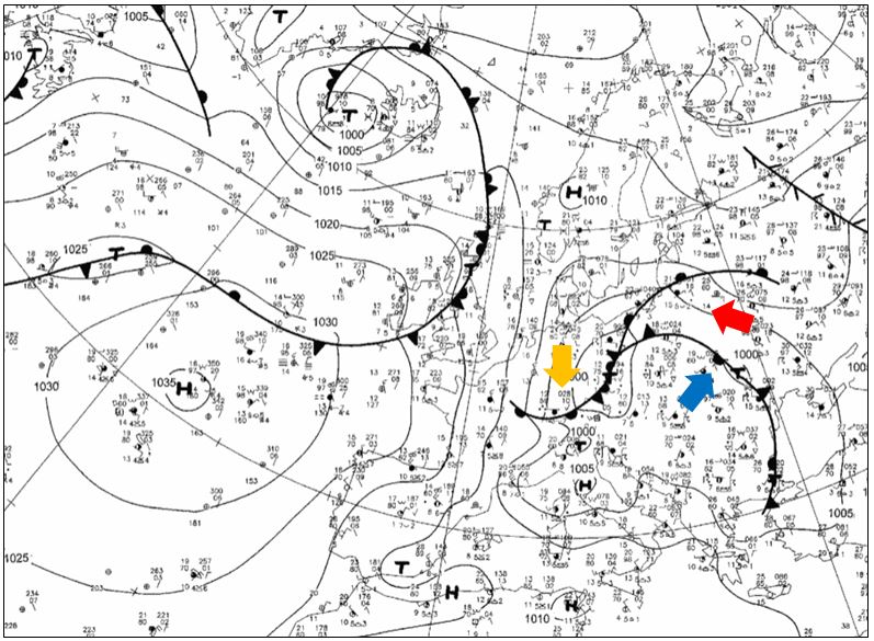 Figure 4.9: Surface Analyses with fronts, 31 May 2013, 12 UTC, source: DWD Movement of the cold airmass (blue) and the warm airmasses (red and orange). Analysis of surface fronts from 31 May at 12 UTC. The arrows indicate the directions in which the air masses moved: blue for the cold air mass, and red and yellow for the warm air masses. Source: DWD