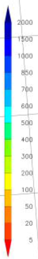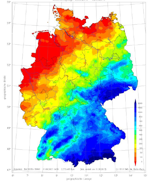 Figure 7.1: Summary of precipitation between 30 May and 2 June 2013 in 1/10 mm across Germany. Source (1); a bigger legend on the right