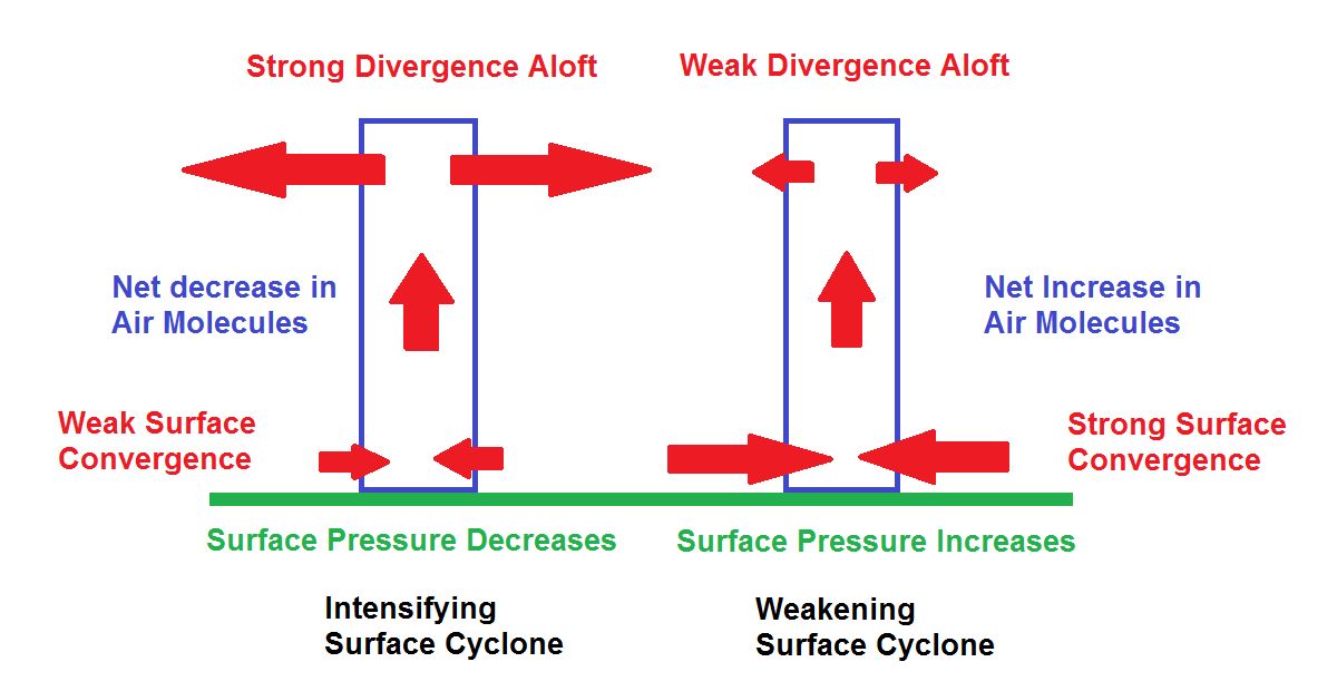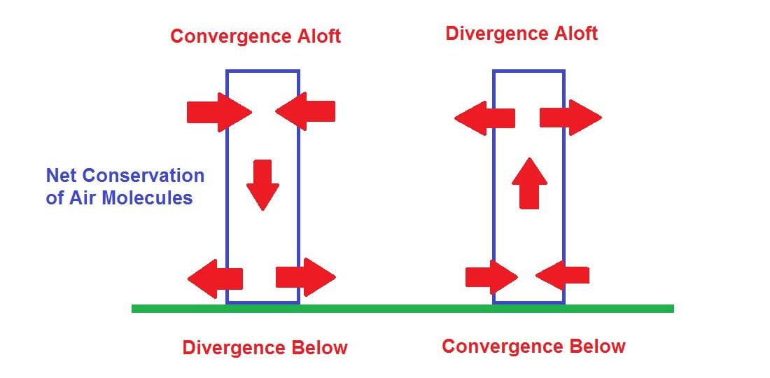 Divergence aloft (below the tropopause) induces rising air due to mass conservation and results in surface convergence; conversely, convergence aloft induces sinking air and surface divergence (see Figure 1).