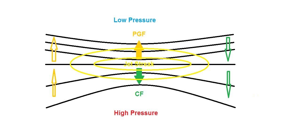 The lifting effect is even further enhanced when two jet streaks are placed such that the left exit region of one jet is co-located with the right entrance region of a second jet (so called Jet Streak Coupling).