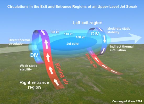 Figure 2: Location of convergence (CON) and divergence (DIV) areas in the entrance and exit region of a jet streak, © NOAA