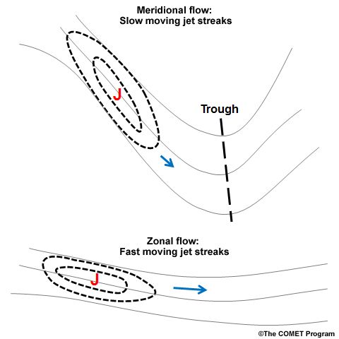 Figure 3: Meridional and zonal flow of the jet stream and the effect on jet streaks