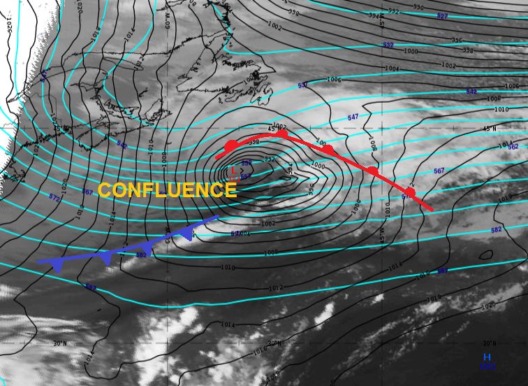 Figure 2: A Shapiro-Keyser cyclone (SEVIRI IR10.8 μm, 5 October 2019, 03:00 UTC). Cyan isolines depict the geopotential at 500 hPa and black isolines the mean surface pressure