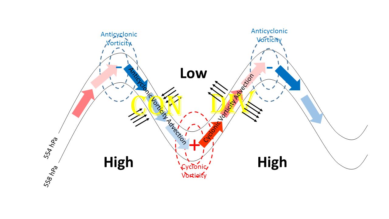 On a global scale (e.g. Rossby waves), troughs are associated with cyclonic vorticity at upper-levels, while ridges are associated with anticyclonic vorticity (see Figure 1 below). An air parcel moving along a Rossby wave will thus advect cyclonic vorticity (PVA in the northern hemisphere) when moving northward along the eastern side of the trough, and advect anticyclonic vorticity (NVA in the northern hemisphere) when moving southward along the rear side of the trough. The increase of PVA or NVA with height results from higher wind speeds at jet level compared to the ground.
