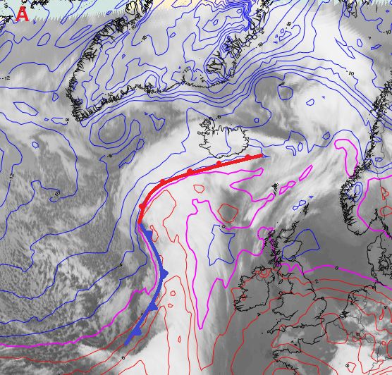 Figure 1: SEVIRI IR10.8 μm images from 8 and 9 January 2018 (18, 00, 06 and 12 UTC from top left to bottom right). Isolines of the temperature at 850 hPa and the position of the cold and warm front in a Shapiro-Keyser cyclone.