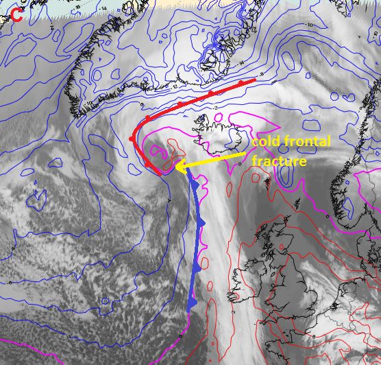 As can be seen in Figure 1 (lower left), during the cold frontal fracture process the cold and warm front are still attached to each other at lower levels, with an inactive baroclinic boundary. This low-level boundary is eroded from above by cold air during the seclusion process.