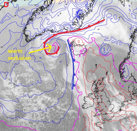 The warm core seclusion process takes place at lower tropospheric levels. It is the main characteristic of the Shapiro-Keyser cyclone and, together with the cold frontal fracture, distinguishes it from the Norwegian cyclone model. The two processes are tightly connected and occur when the cyclone reaches the maturity stage.