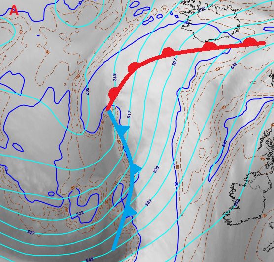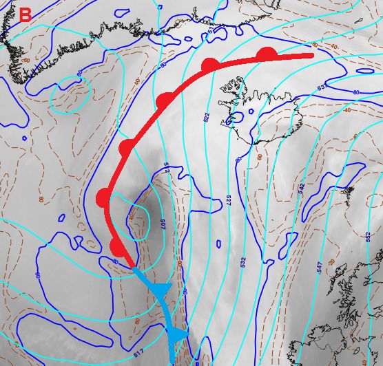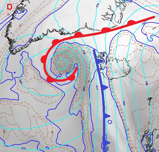 As warm air is encapsulated, the thermal gradient, which is an important characteristic of a cold front, becomes weaker at the northern tip of the cold front. Due to the progression of warm air from the warm sector (B), the warm front extends southward. This bent-back warm front, which delimits the warm core of the cyclone from surrounding colder air, is visible in IR imagery as a cyclonic cloud band similar to the occlusion cloud band in Norwegian cyclones (C). In fact, the occlusion process, which occurs for Norwegian cyclone types, does not occur here. In the final step (D), cold air from behind the cold front starts to seclude the warm core from the warm sector.