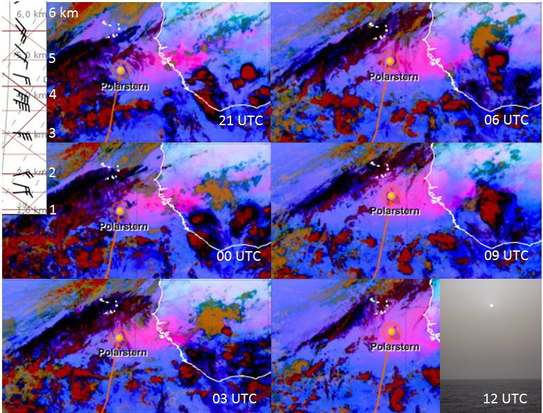 Fig. L3-2 shows a sequence of Dust RGB images. The dust is moving westward and the Polarstern's course runs through this area. Normally the sky would be nearly clear and here you can see the effects of dense dust.
