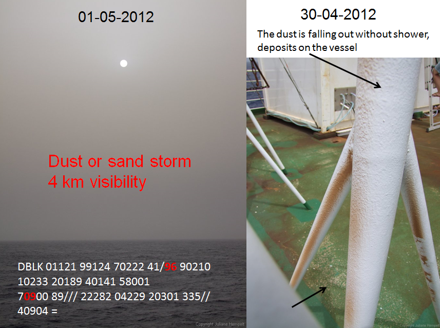 Figure L3-3: Dust deposit on the ship on 30 April 2012 (right), and a view of the hazy sky and ocean surface with the SYNOP code at 12 UTC (left). Source: Juliane Hempelt (DWD).