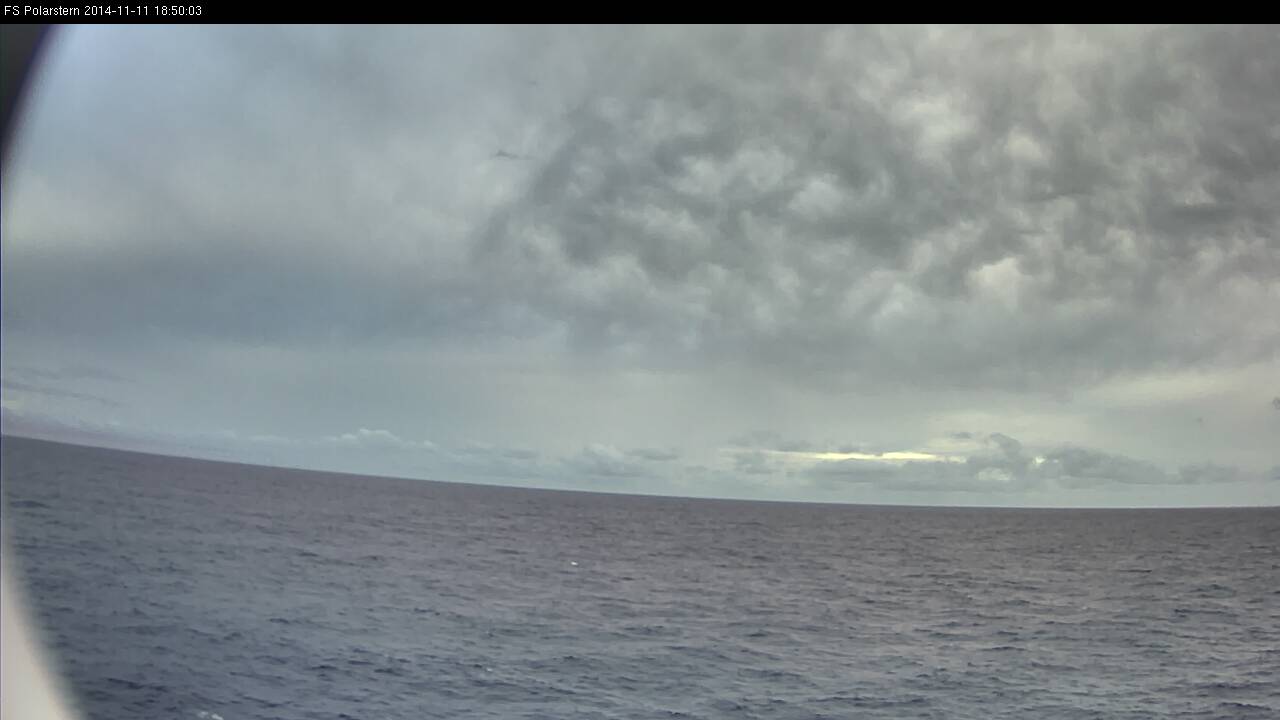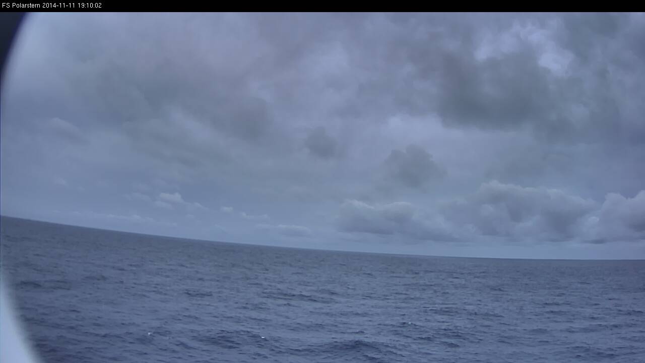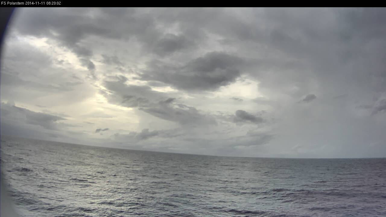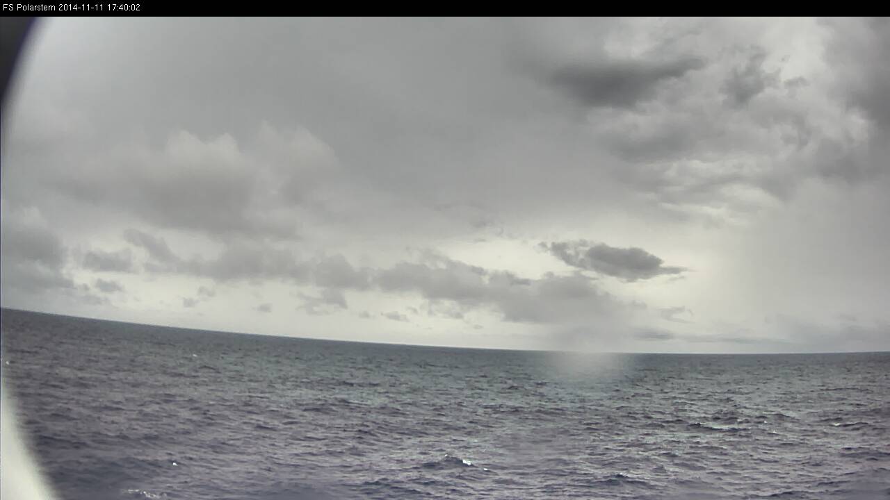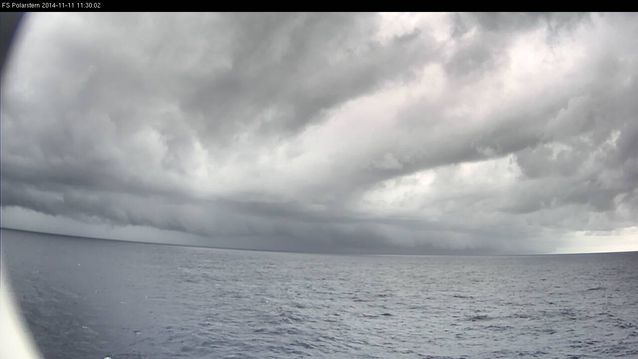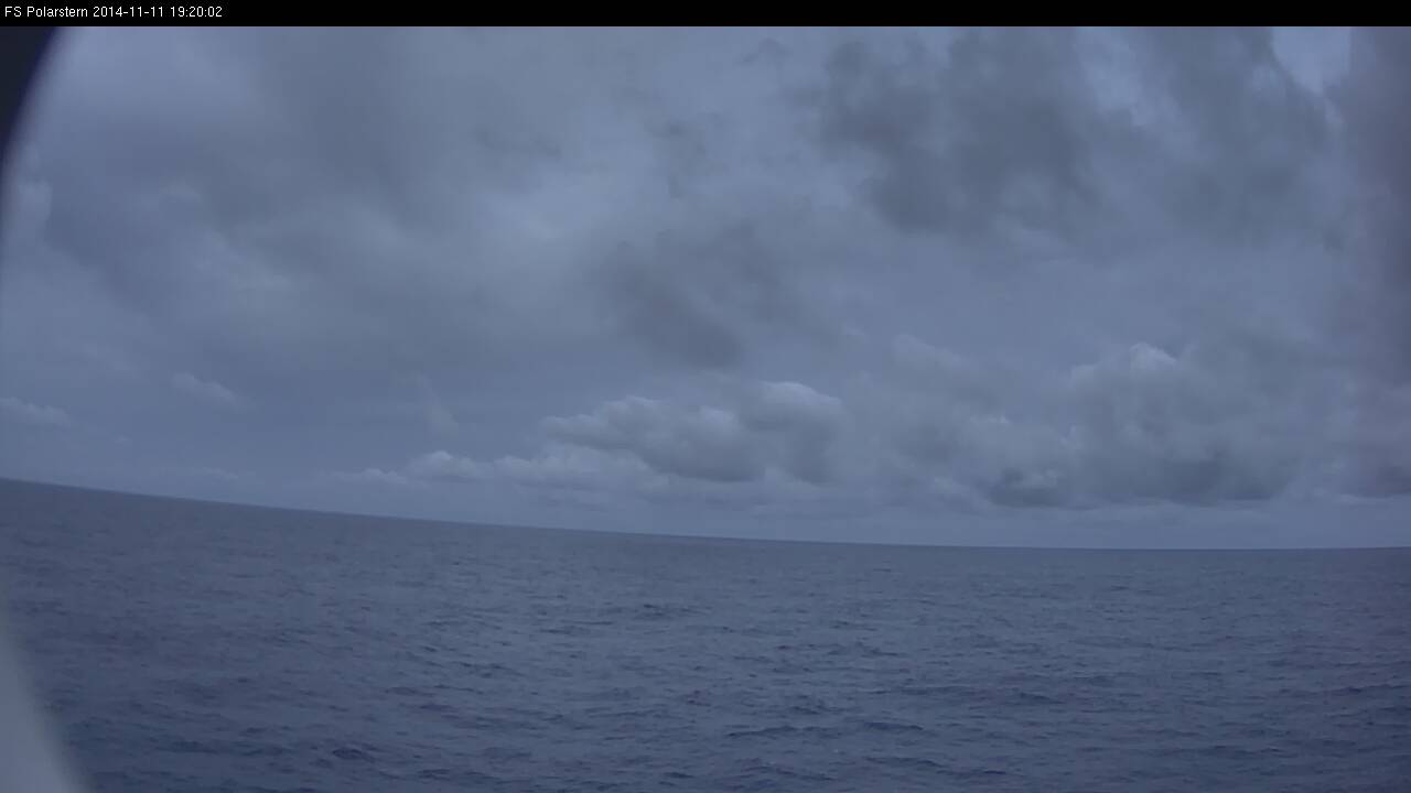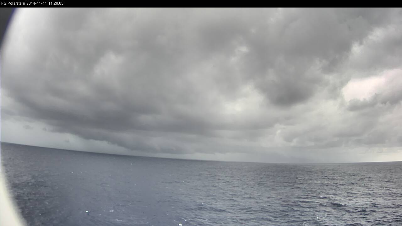 The SYNOP from 12:00 UTC reports a light rainshower. Due to the moist airmass with a dewpoint of 22,9°C and the turbulence, the condensation level is very low. Evaporation from the sea surface is very high because of how warm the water is; the water temperature measures at 28,1°C. The Polarstern had reached the southern side of the ITCZ's convergence and the wind had veered to a southeasterly direction of 120° and 06 knots. The reported cloud layer is 8/8 (overcast) with cumulonimbus capillatus.