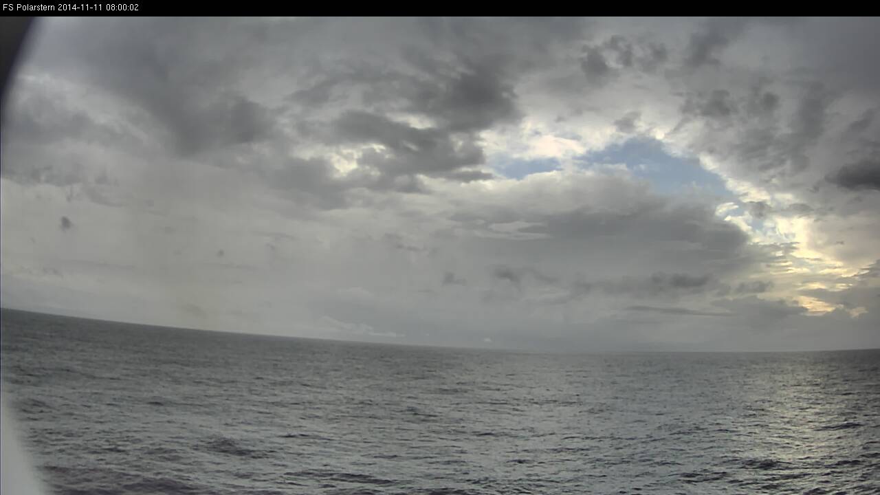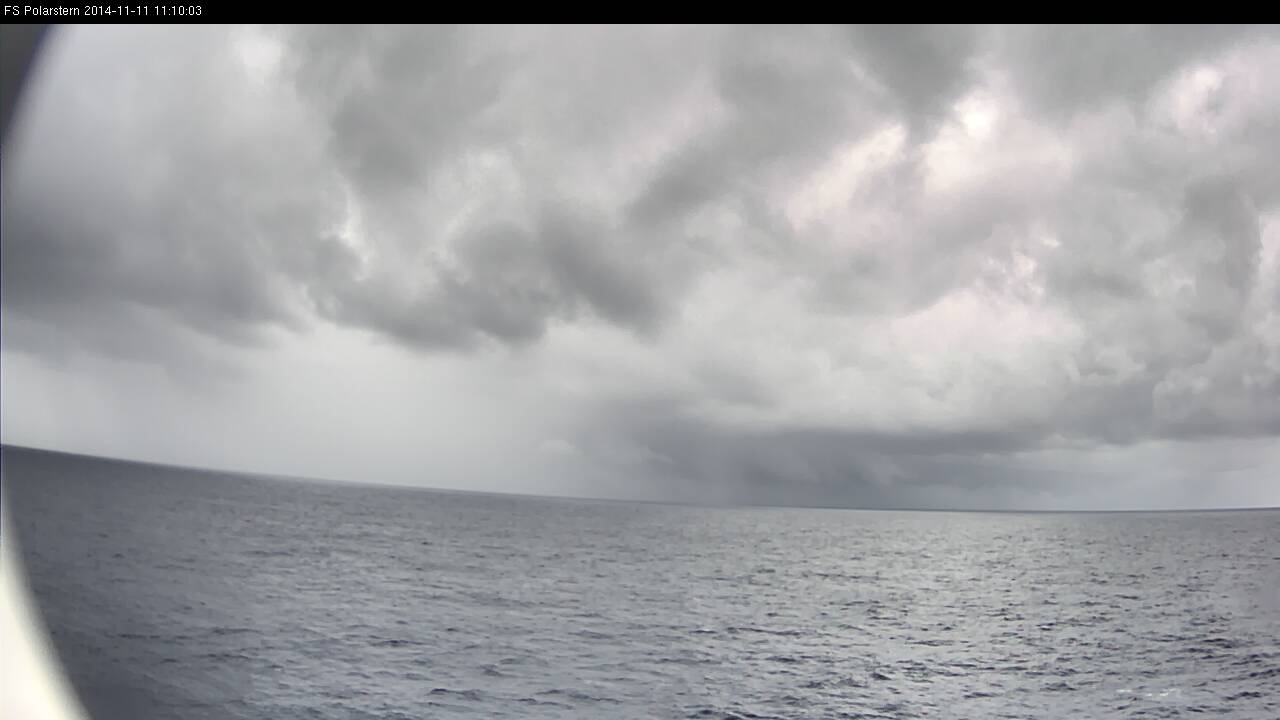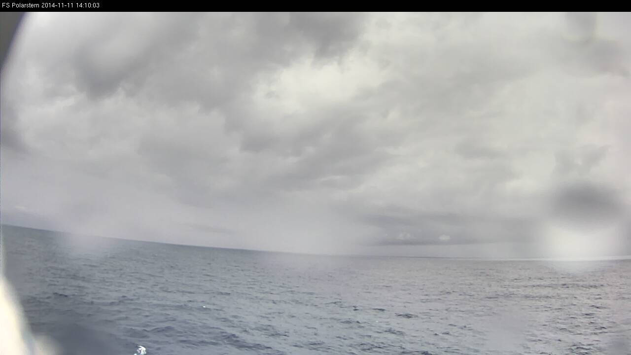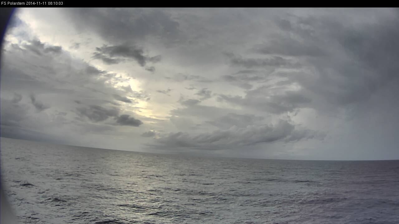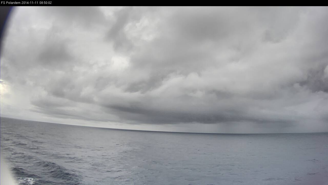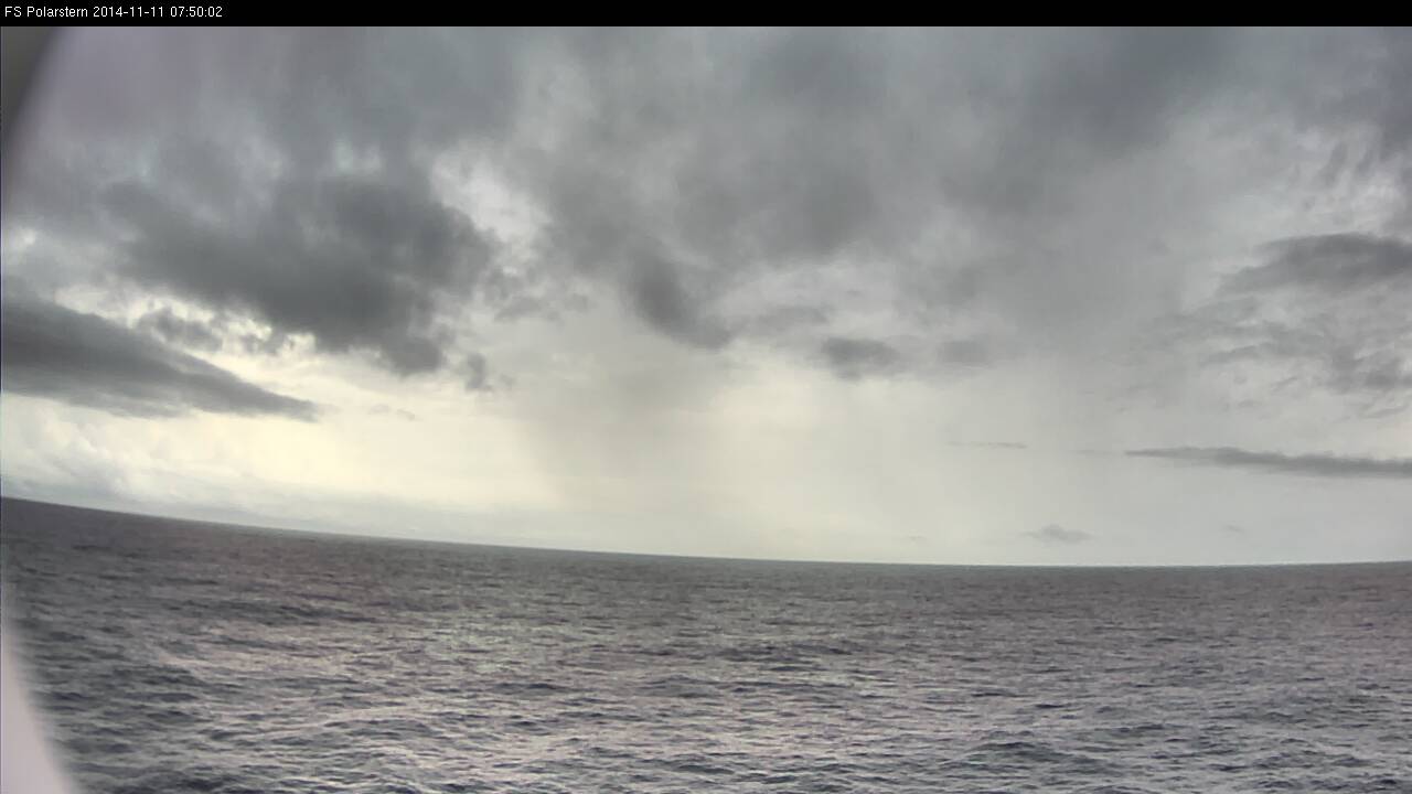The SYNOP from 12:00 UTC reports a light rainshower. Due to the moist airmass with a dewpoint of 22,9°C and the turbulence, the condensation level is very low. Evaporation from the sea surface is very high because of how warm the water is; the water temperature measures at 28,1°C. The Polarstern had reached the southern side of the ITCZ's convergence and the wind had veered to a southeasterly direction of 120° and 06 knots. The reported cloud layer is 8/8 (overcast) with cumulonimbus capillatus.