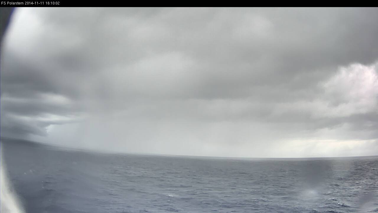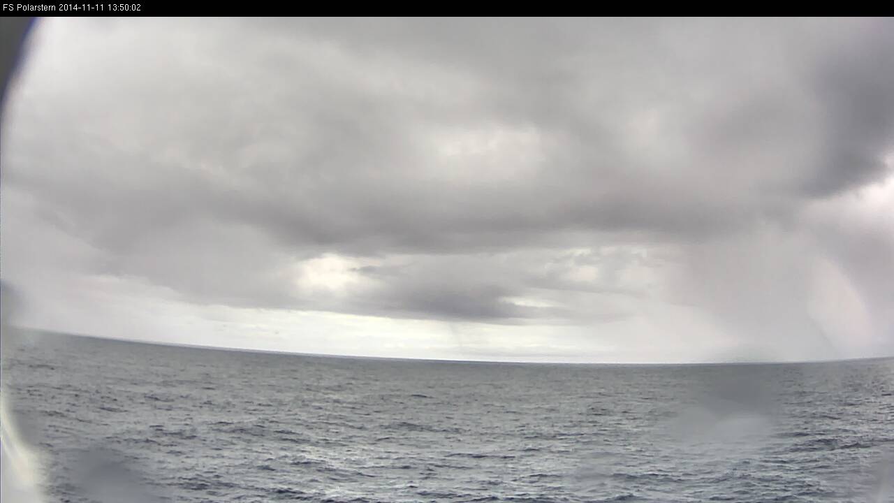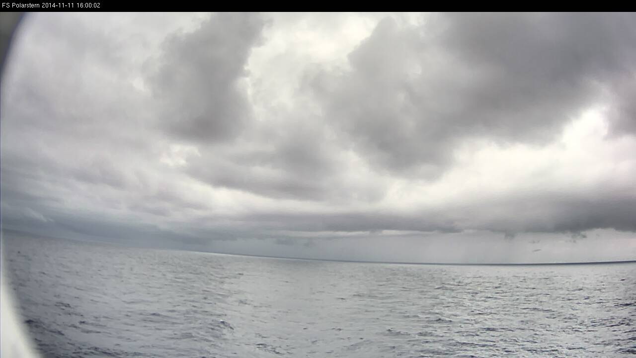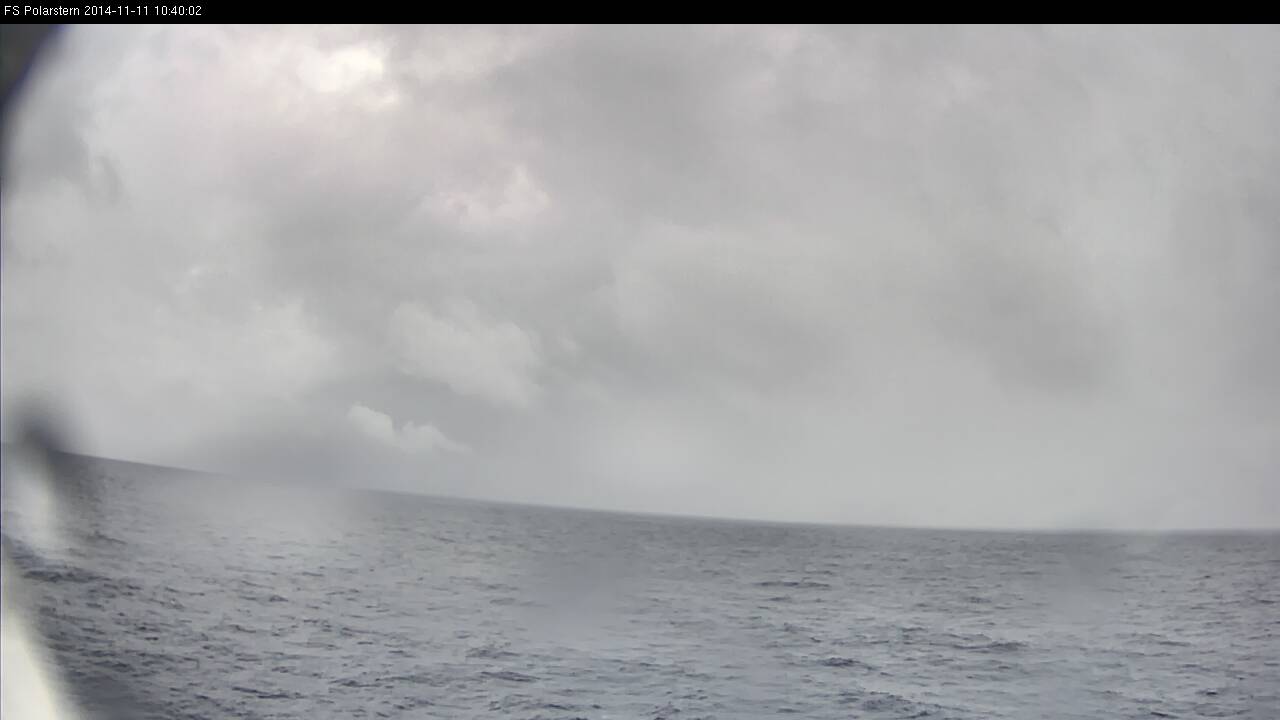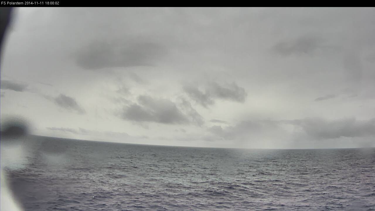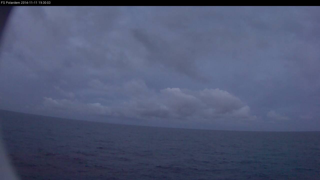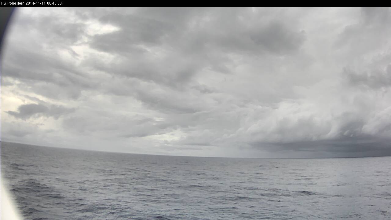 The SYNOP from 12:00 UTC reports a light rainshower. Due to the moist airmass with a dewpoint of 22,9°C and the turbulence, the condensation level is very low. Evaporation from the sea surface is very high because of how warm the water is; the water temperature measures at 28,1°C. The Polarstern had reached the southern side of the ITCZ's convergence and the wind had veered to a southeasterly direction of 120° and 06 knots. The reported cloud layer is 8/8 (overcast) with cumulonimbus capillatus.