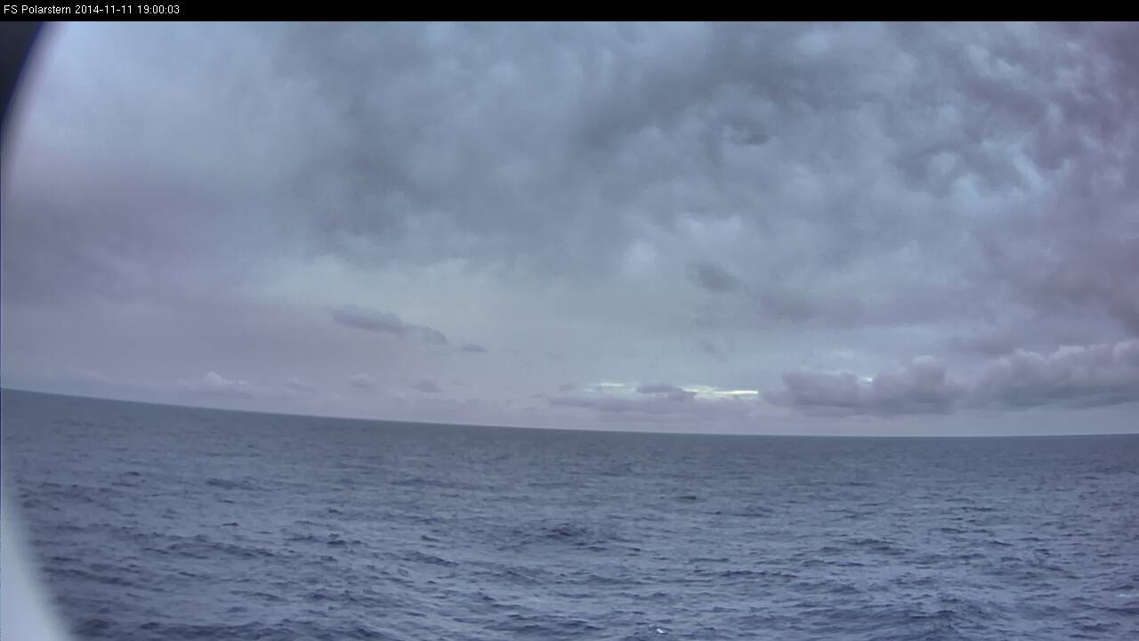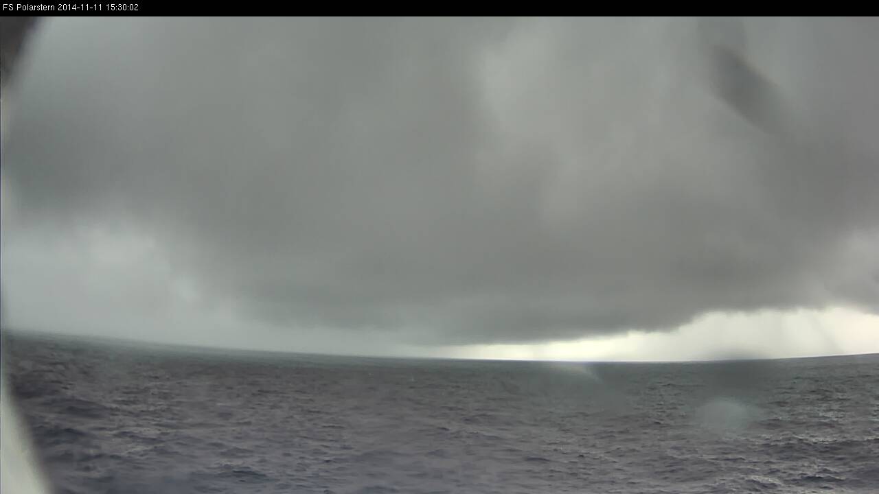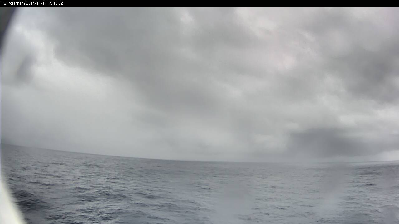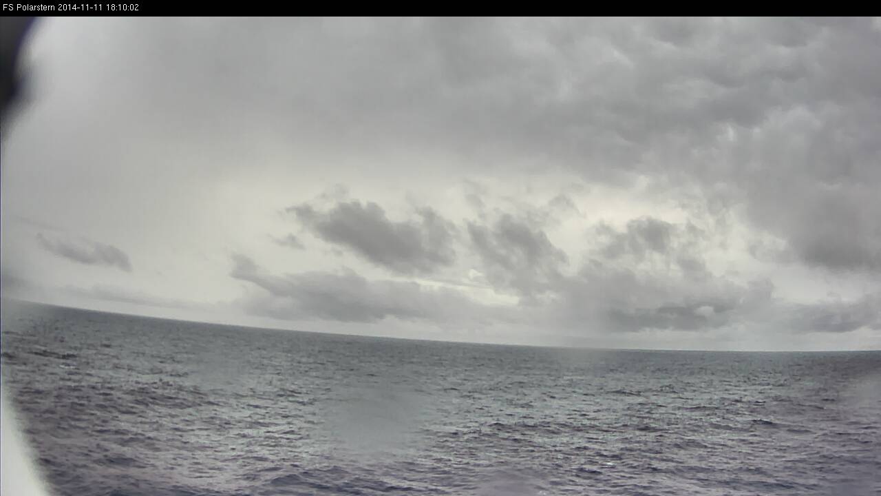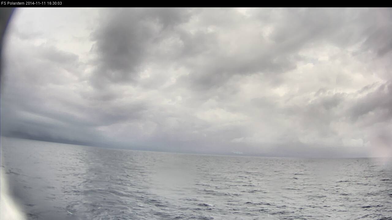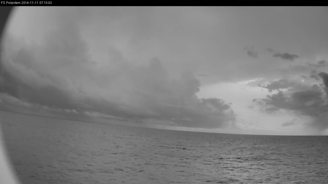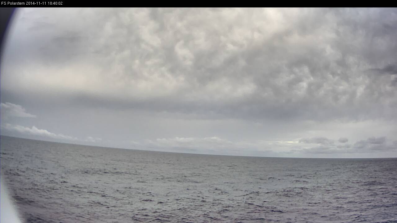 The SYNOP from 12:00 UTC reports a light rainshower. Due to the moist airmass with a dewpoint of 22,9°C and the turbulence, the condensation level is very low. Evaporation from the sea surface is very high because of how warm the water is; the water temperature measures at 28,1°C. The Polarstern had reached the southern side of the ITCZ's convergence and the wind had veered to a southeasterly direction of 120° and 06 knots. The reported cloud layer is 8/8 (overcast) with cumulonimbus capillatus.