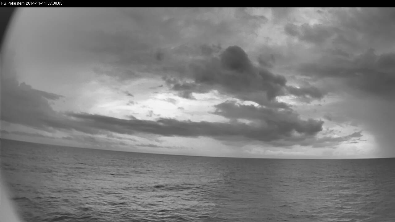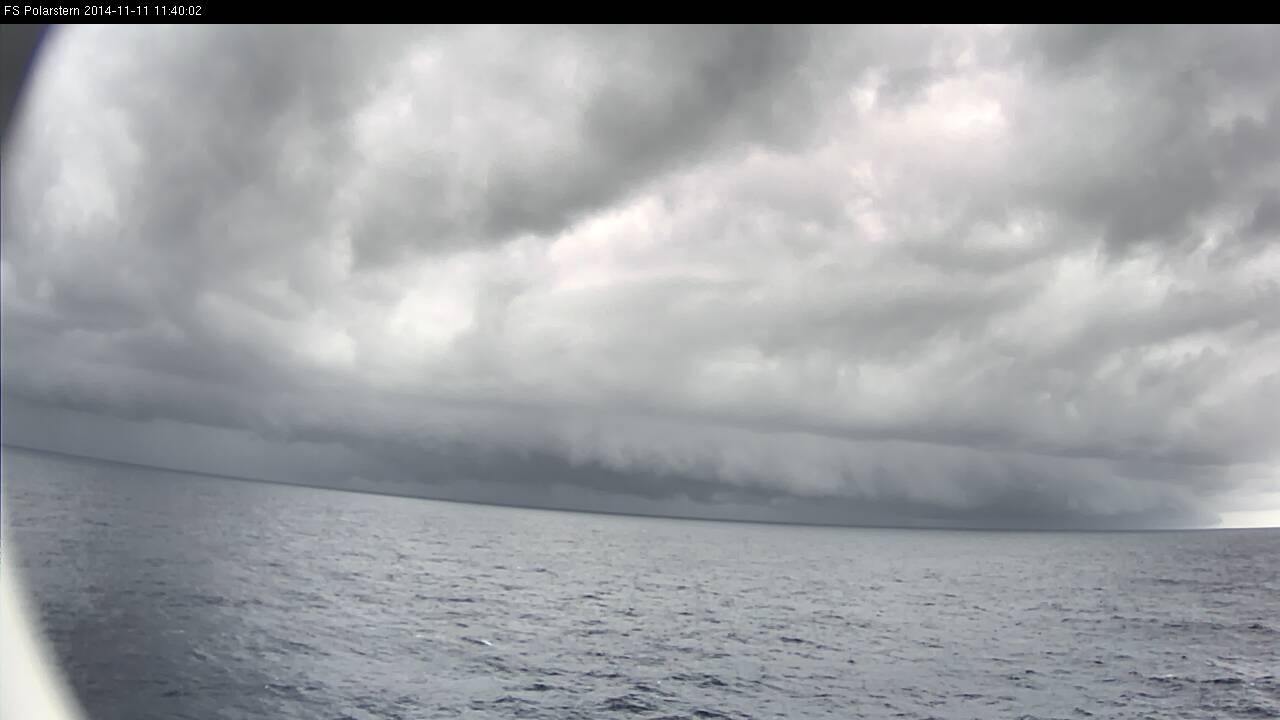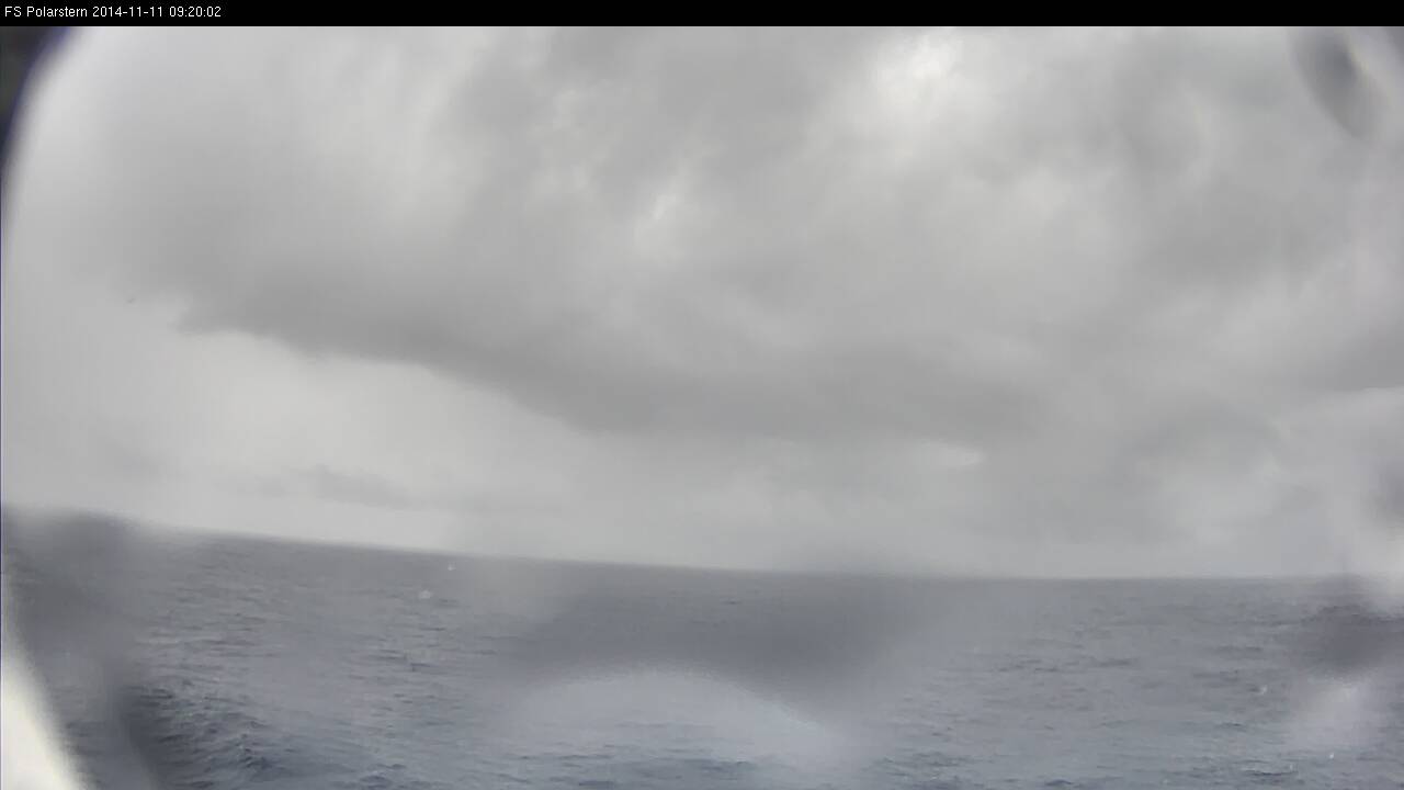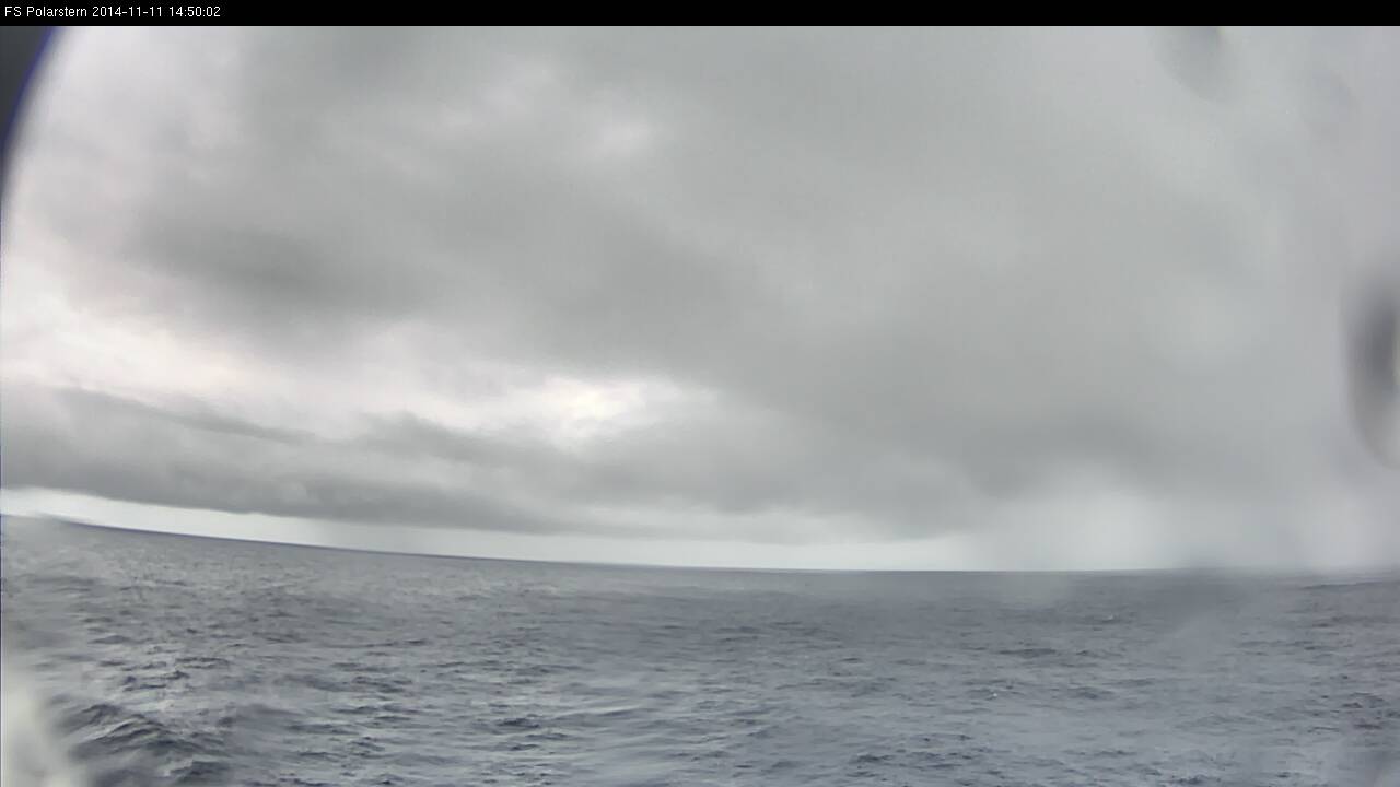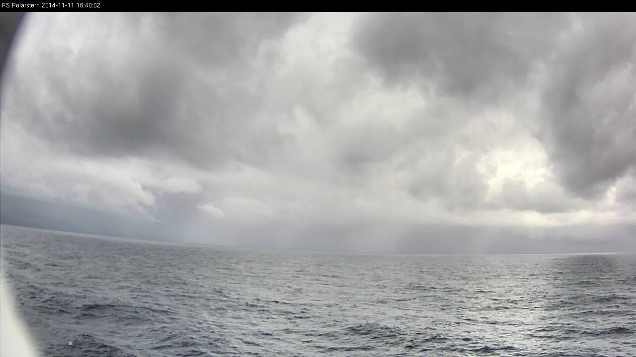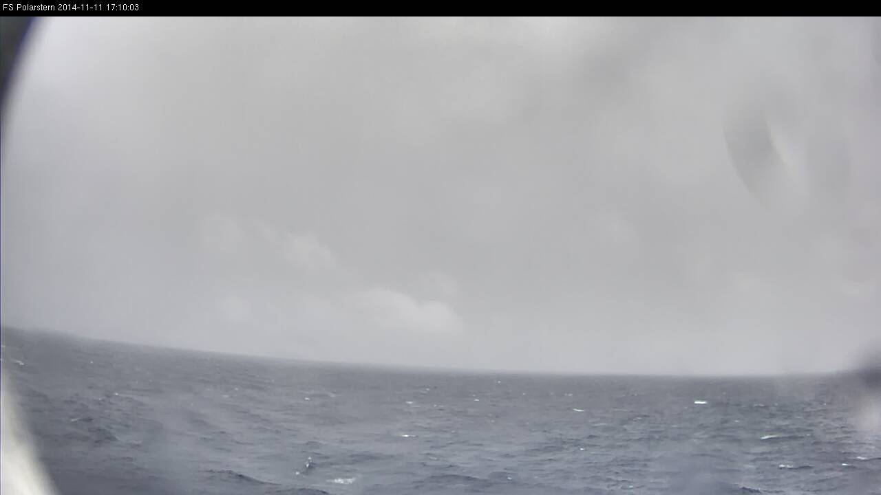 The SYNOP from 12:00 UTC reports a light rainshower. Due to the moist airmass with a dewpoint of 22,9°C and the turbulence, the condensation level is very low. Evaporation from the sea surface is very high because of how warm the water is; the water temperature measures at 28,1°C. The Polarstern had reached the southern side of the ITCZ's convergence and the wind had veered to a southeasterly direction of 120° and 06 knots. The reported cloud layer is 8/8 (overcast) with cumulonimbus capillatus.