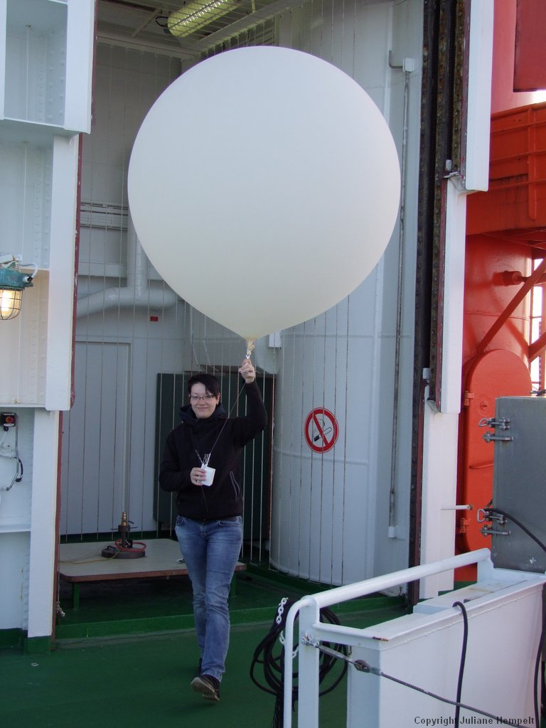 On every expedition of the Polarstern, a forecaster from Deutscher Wetterdienst (DWD) is responsible for important weather forecasts. The realization of most maritime expeditions and helicopter flights depends on good weather conditions, which is why the daily weather briefing for the crew and scientists is very important (Figure 1-5). The second staff member of Deutscher Wetterdienst is an observer/technician whose responsibilities include weather observation and radio soundings (Figures 1-6a to 1-6c).