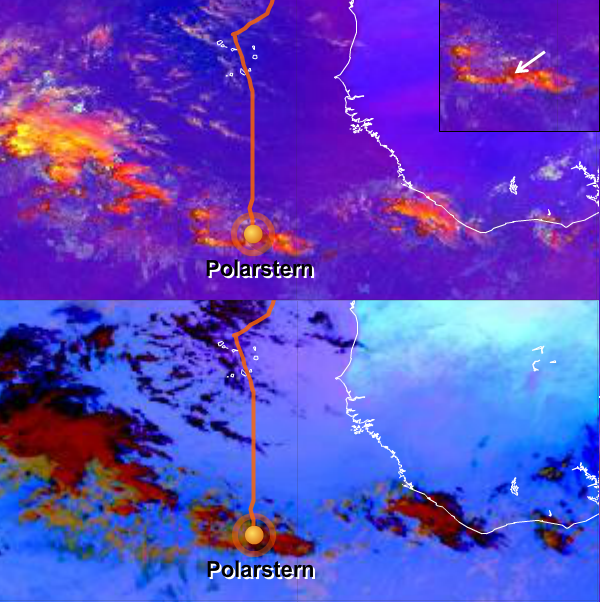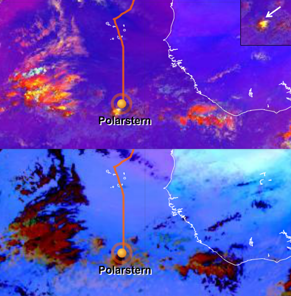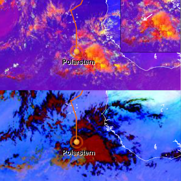 The Polarstern was sailing in the southern part of the northeastern trade winds and very close to the intertropical convergence zone. Figure L2-5's top half shows a Severe Storms RGB where the yellow dots suggest strong convection due to small ice particles at the cloud tops. The instability is strong enough to generate a thunderstorm near the Polarstern's position at 12:00 UTC. The position of the vessel and the thunderstorm are marked with a white arrow in the small detail square at the top right. You will find a brief description about the colors around the Polarstern's position in the Colour Interpretation Guide.