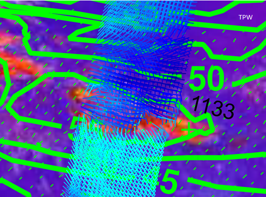 Fig. L2-18 shows two important ingredients of strong thunderstorms: total precipitable water (TPW) from the ECMWF model with a maximum around the ITCZ, and the aforementioned wind convergence. The TPW is the depth of water in a column of the atmosphere, from the surface to the top of the atmosphere, if all the water in that column were precipitated as rain.