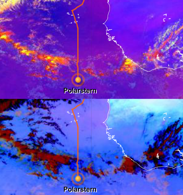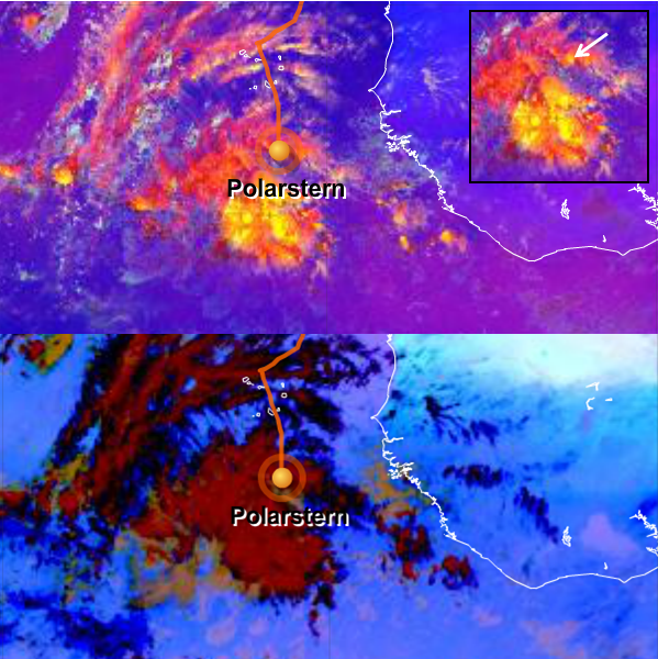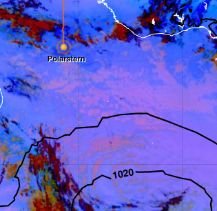 The small, strong yellow area south of the Polarstern's position (orange dot and white arrow) marks strong thunderstorms in the Severe Storms RGB. This is the biggest advantage of this RGB.