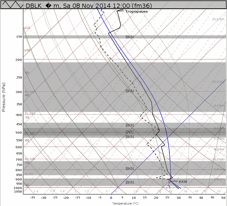Figure L2-7: Sounding from the Polarstern, 8 Nov 2014, 12:00 UTC. KKN = Lifted condensation level. BKN (broken) = 5/8-7/8 cloud cover in the given layer, OVC (overcast) = 8/8 cloud cover in the given layer. Source: DWD.
