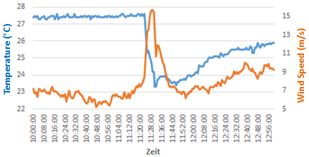 Figure L2-8: Course of temperature and wind speed on 8 Nov 2014 from 10:00 UTC to 12:56 UTC measured on the Polarstern during a thunderstorm. Source: DWD.