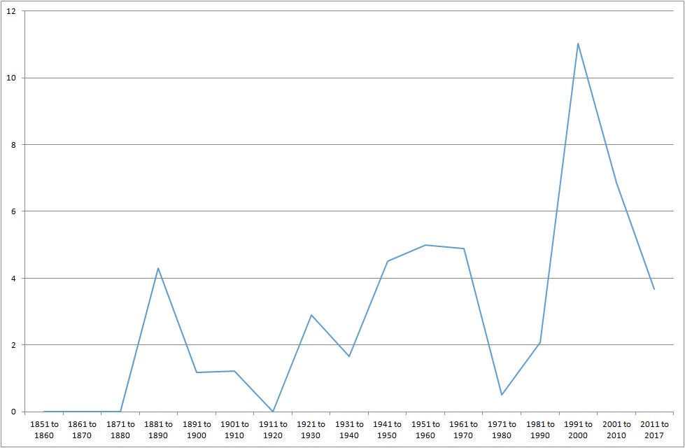Figure 2: Number of hurricanes per decade that travelled towards Europe. Since hurricanes are relatively rare phenomenon they are grouped in decades.