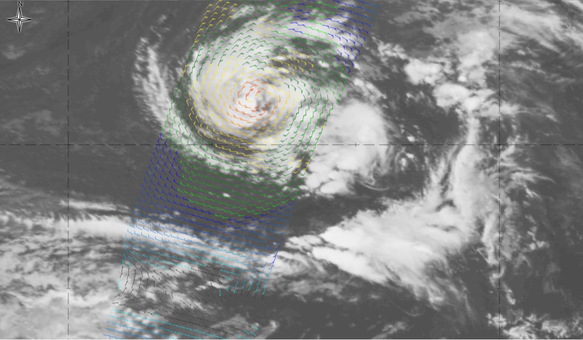 An ASCAT overpass in the region of interest gives the wind speed over the storm Figure 12. This data reveals gale winds (30 kt-orange colour) over a large area, and up to 45 kt (red colour) near the centre of the storm.