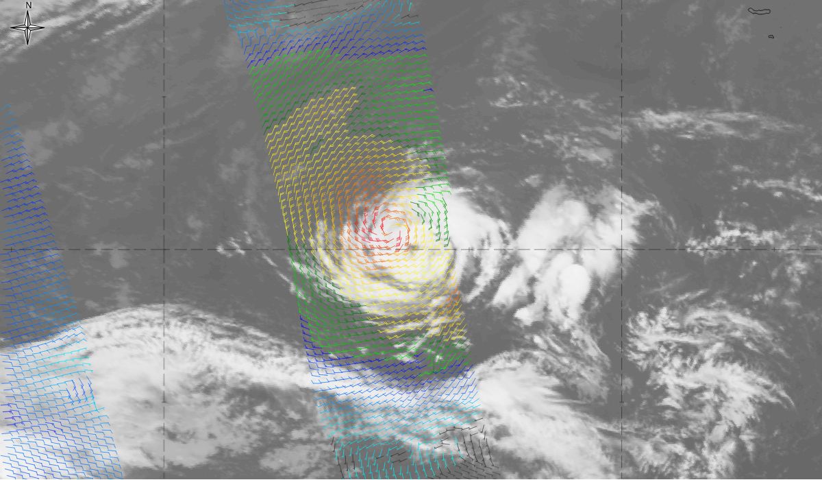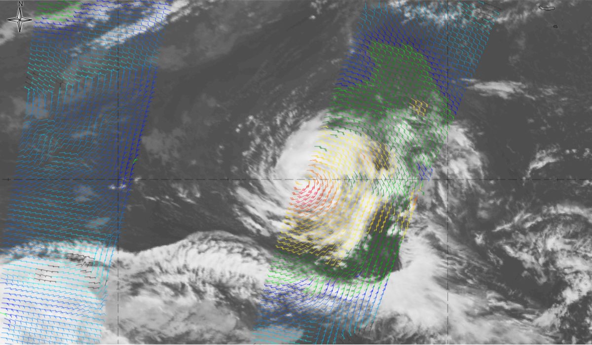 Figure 15: ASCAT wind (colour wind barbs) overlaid on Meteosat 10 IR 10.8 on 11th October 2017, 18:00 UTC (source: EUMeTrain, ePort) (click on the image to zoom in)