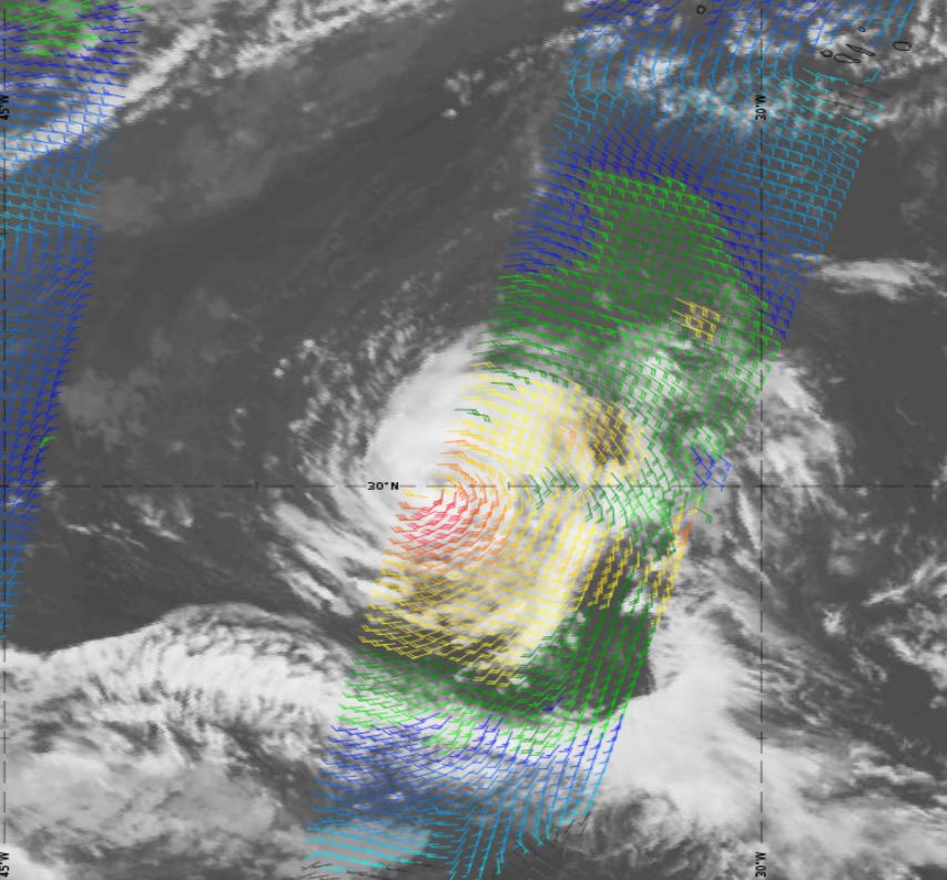 Tropical storm Ophelia was mostly stationary while steadily strengthening. It started to move slowly towards the southeast and became a Category 1 hurricane on the Saffir-Simpson scale after 18:00 UTC on 11th October 2017 (Figure 14.1 and 14.2). It was located 660 nautical miles (approx. 1200 km) southwest of the Azores (29.8 °N, 36.2 °W) with a wind speed of about 65 kt. The ASCAT data shows wind speed on the southwest part of the storm Figure 15.