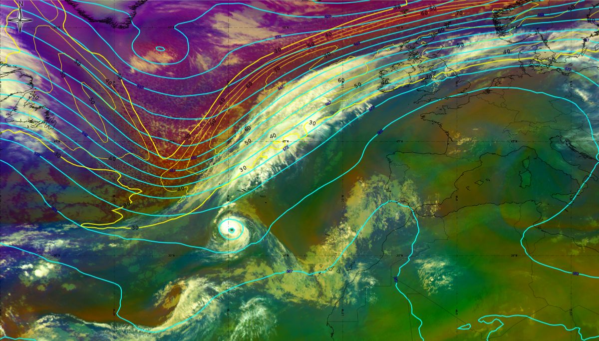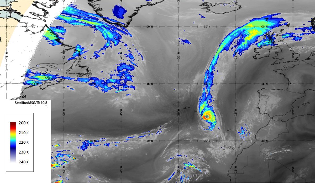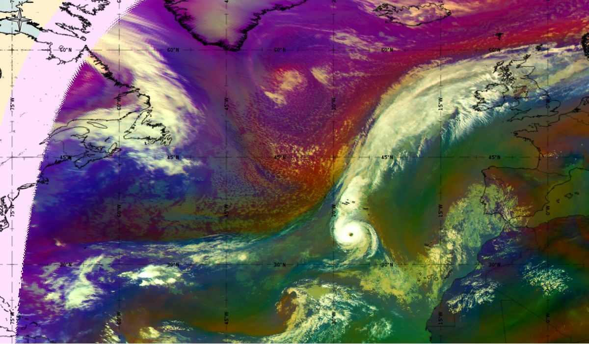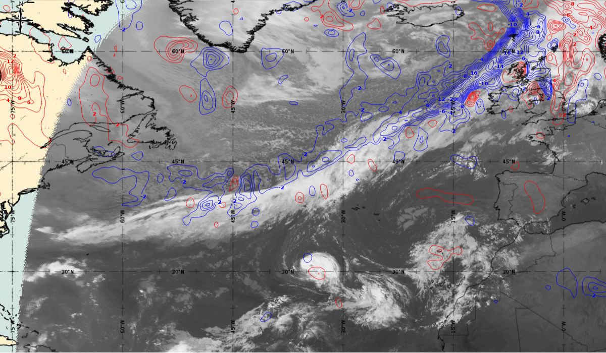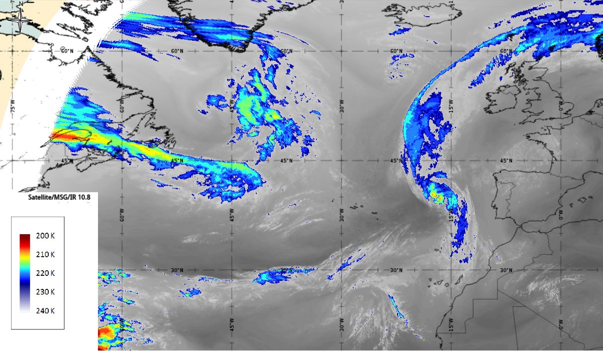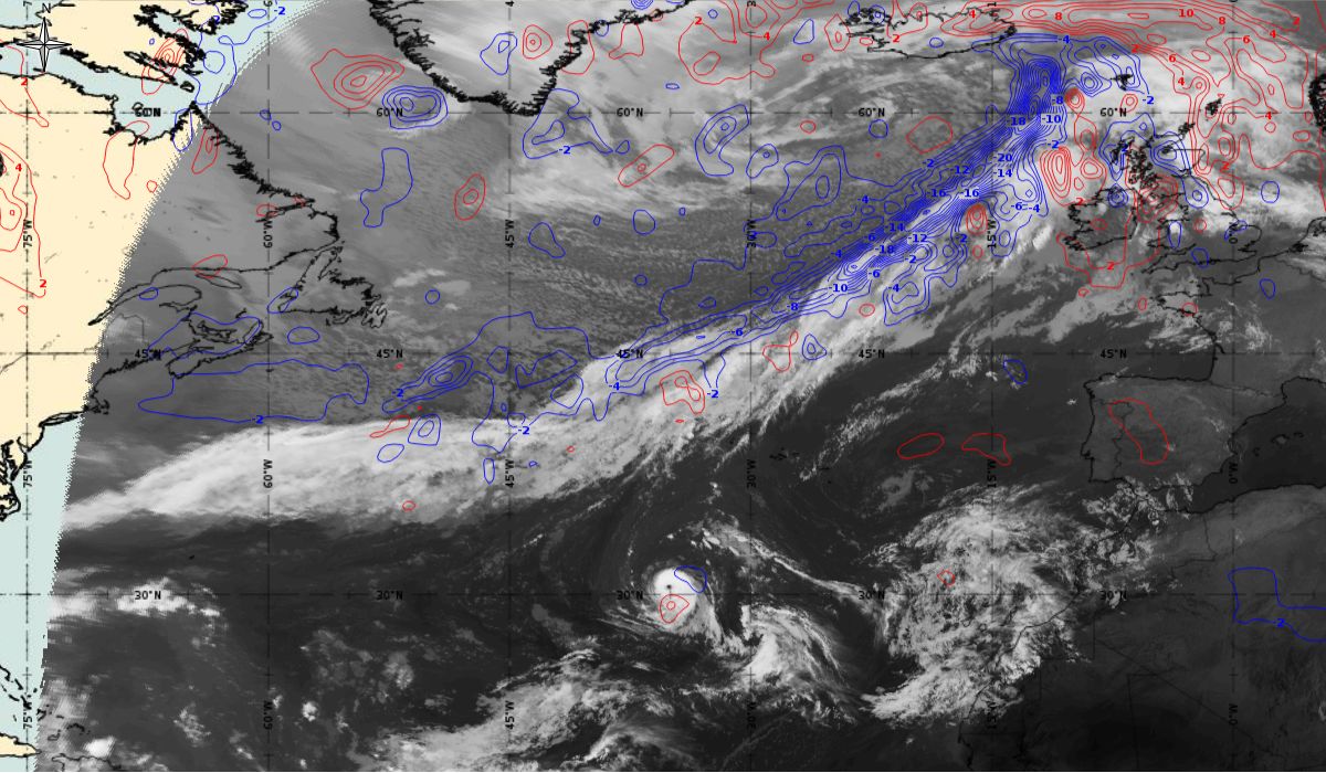 In the beginning, hurricane Ophelia is still in a relatively warm environment, however in the last phase of the transition, stratospheric air at the rear side of the cloud band (red colour) coincides with the upper level trough. The jet stream is clearly visible in transition from blue to red colours, like a pinstripe at the rear side of the cloud band. The jet is coming from behind/above the cold front. The moving to the northeast and development of a comma cloud took place in the left exit region of a jet.