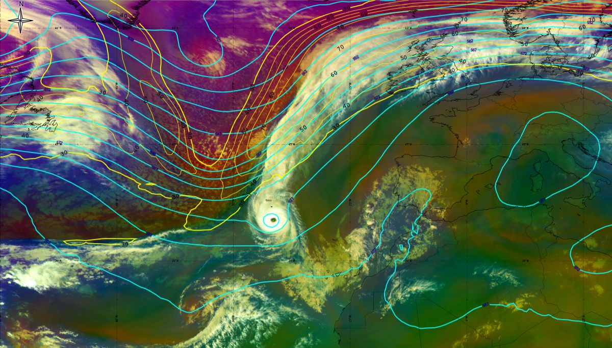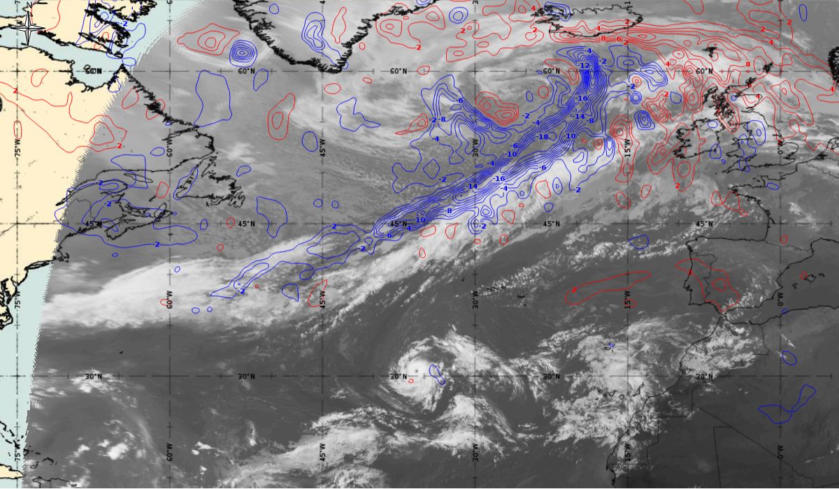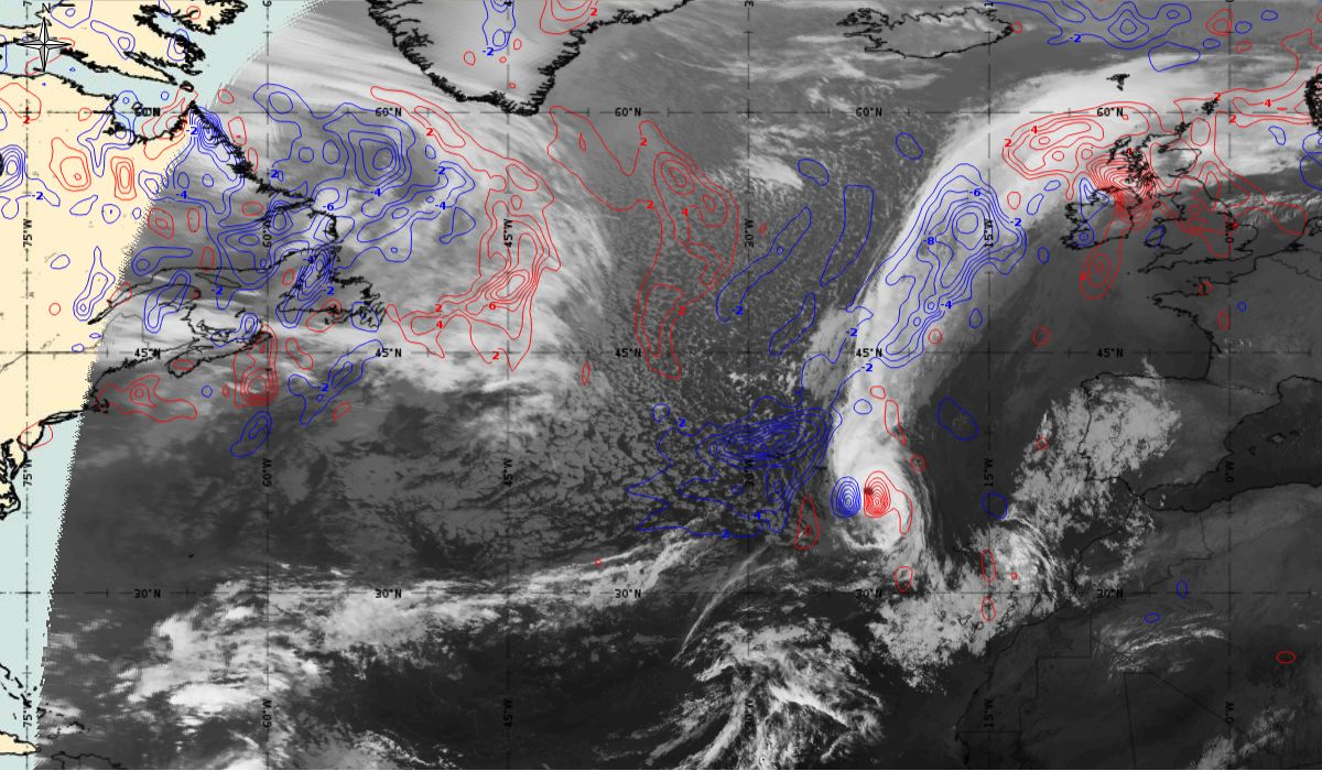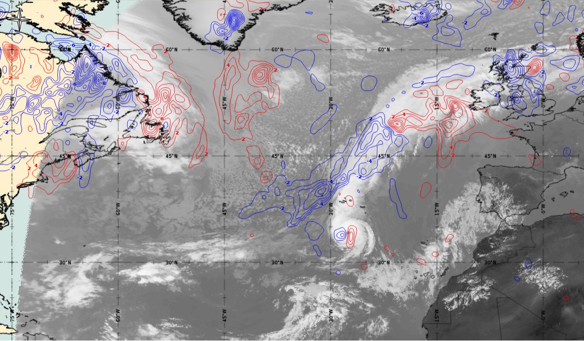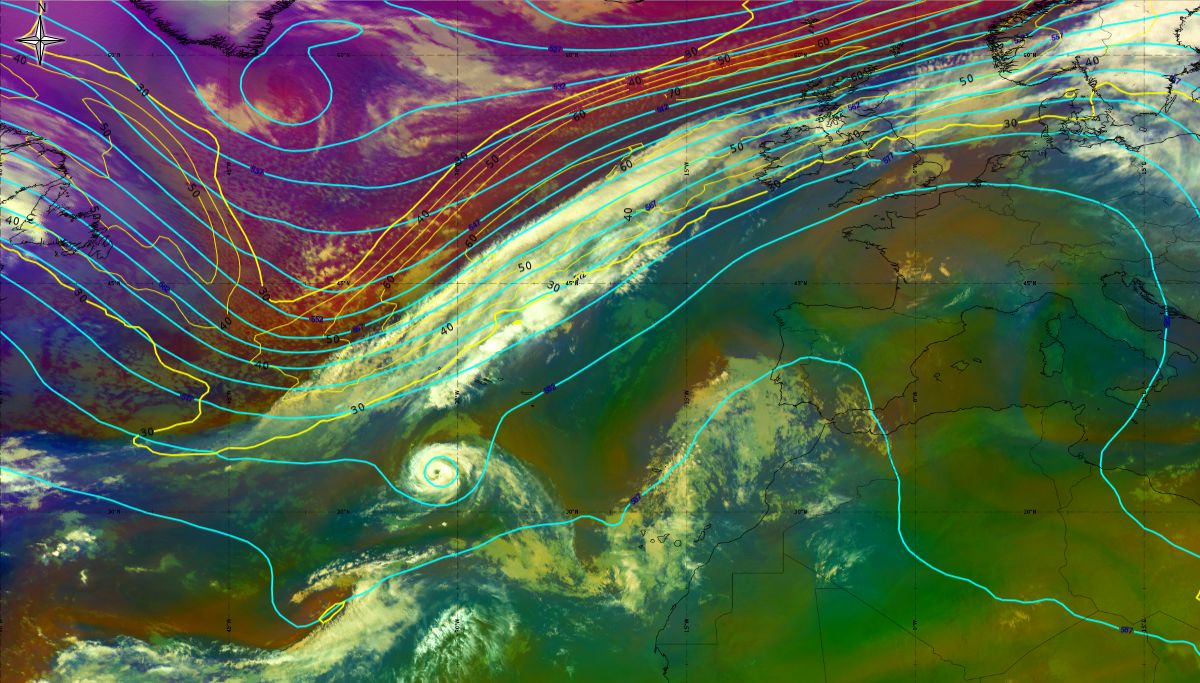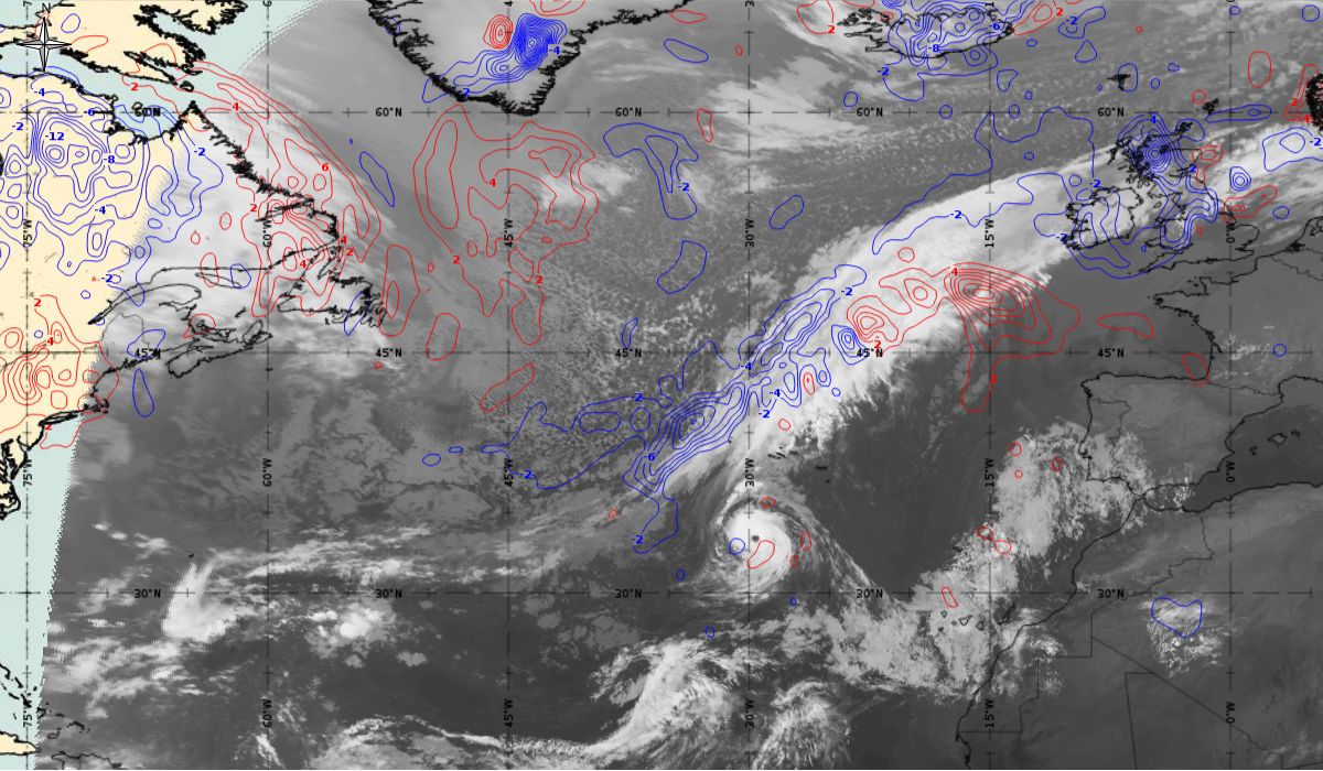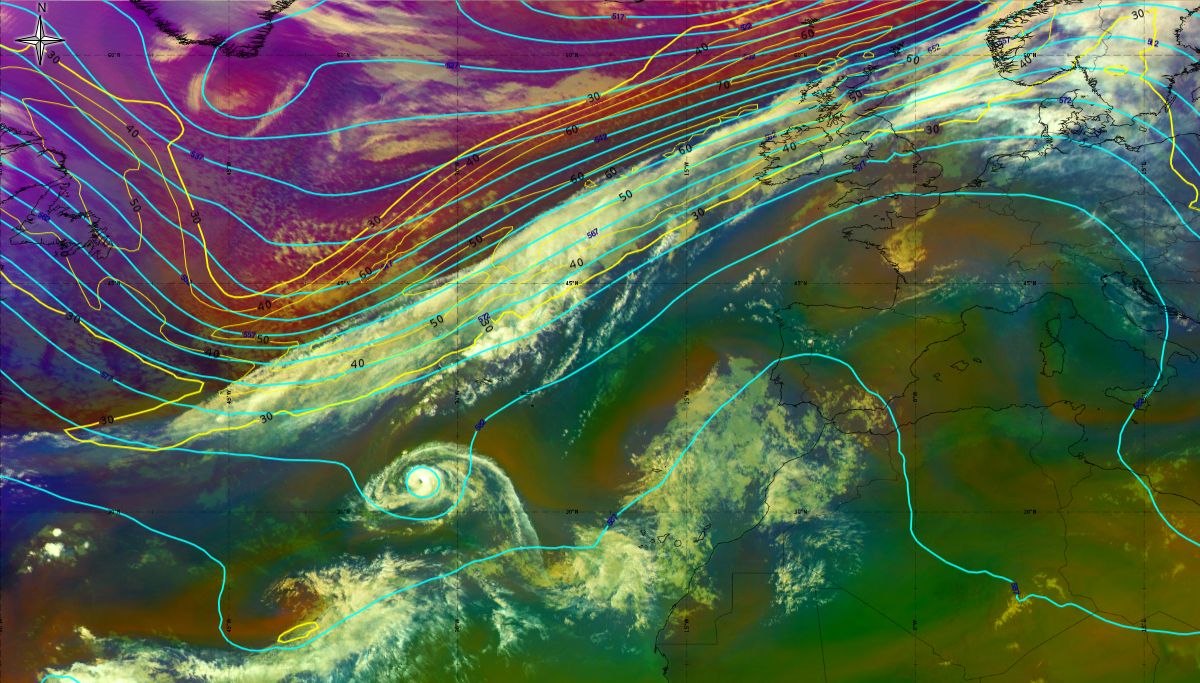 In the beginning, hurricane Ophelia is still in a relatively warm environment, however in the last phase of the transition, stratospheric air at the rear side of the cloud band (red colour) coincides with the upper level trough. The jet stream is clearly visible in transition from blue to red colours, like a pinstripe at the rear side of the cloud band. The jet is coming from behind/above the cold front. The moving to the northeast and development of a comma cloud took place in the left exit region of a jet.