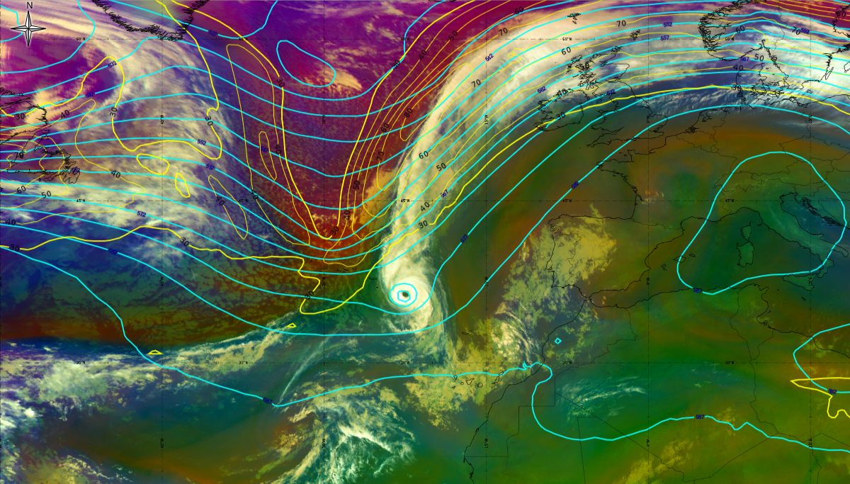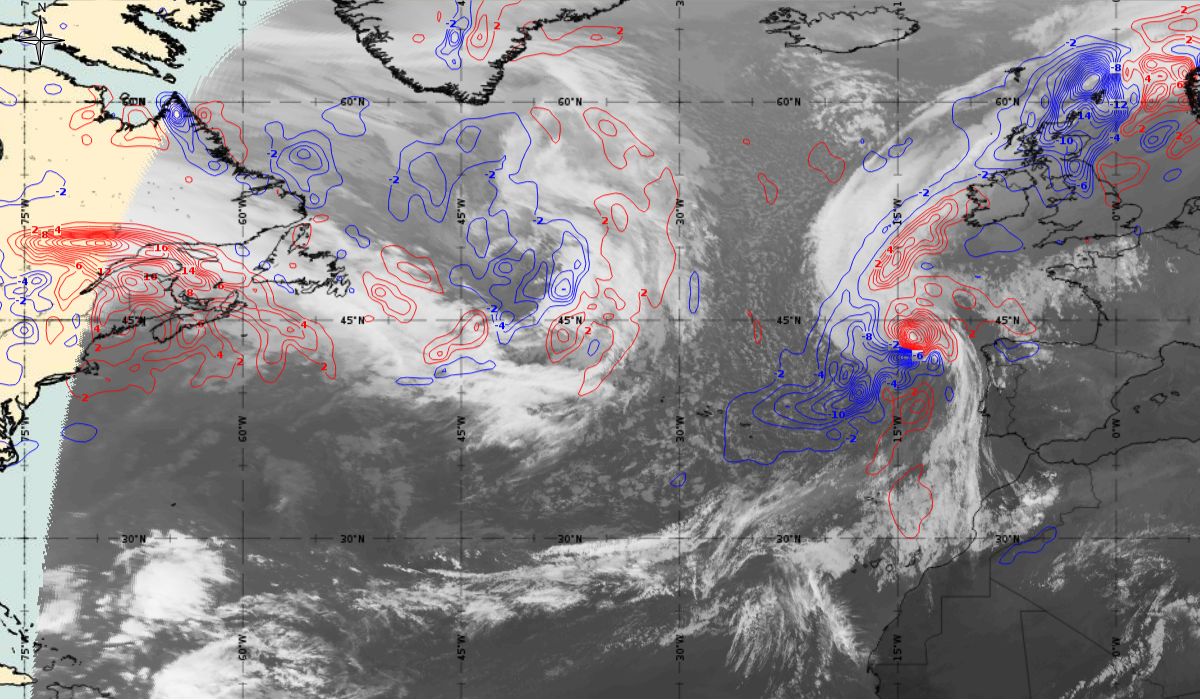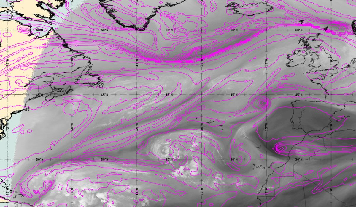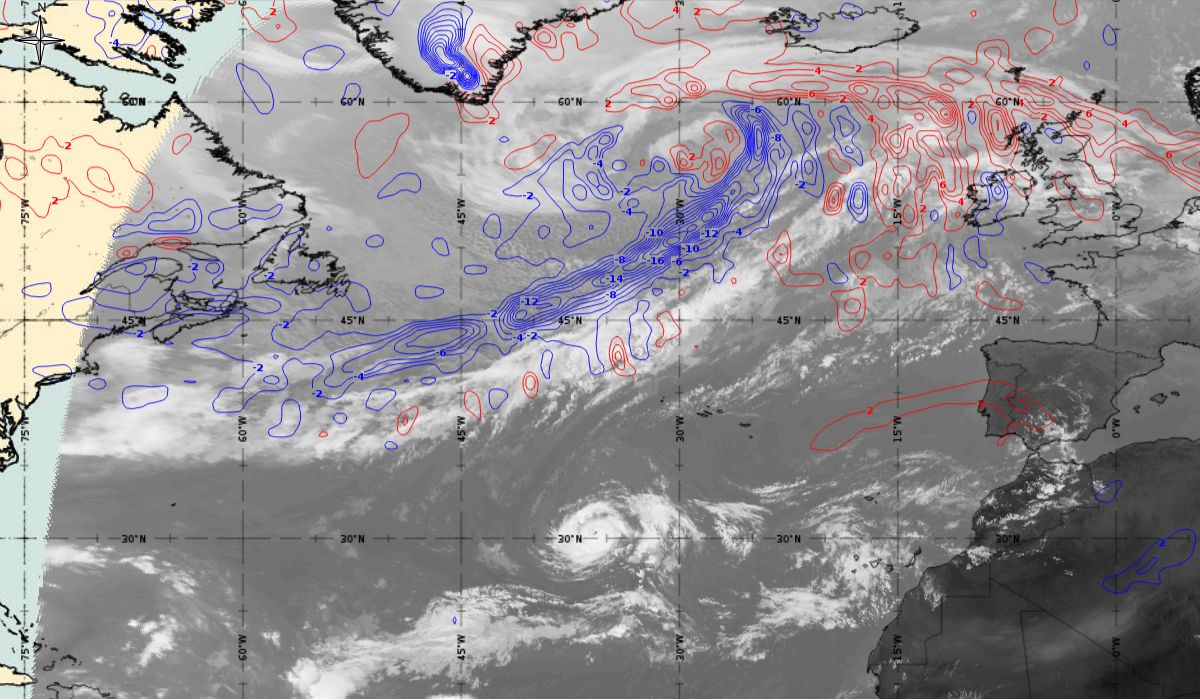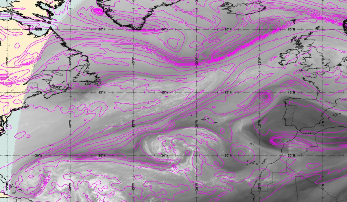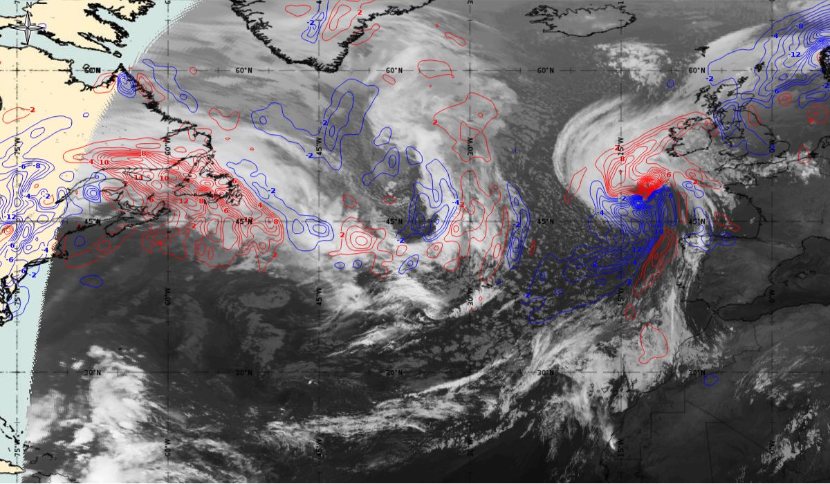 In the beginning, hurricane Ophelia is still in a relatively warm environment, however in the last phase of the transition, stratospheric air at the rear side of the cloud band (red colour) coincides with the upper level trough. The jet stream is clearly visible in transition from blue to red colours, like a pinstripe at the rear side of the cloud band. The jet is coming from behind/above the cold front. The moving to the northeast and development of a comma cloud took place in the left exit region of a jet.