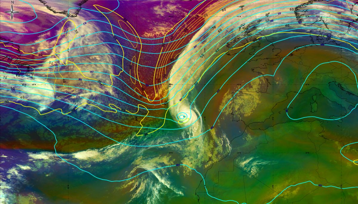Figure 7: 8th October 2017 00:00 UTC - MSG Airmass RGB, geopotential height at 500 hPa (blue line), jet (yellow line - both ECMWF), source: EUMeTrain, ePort