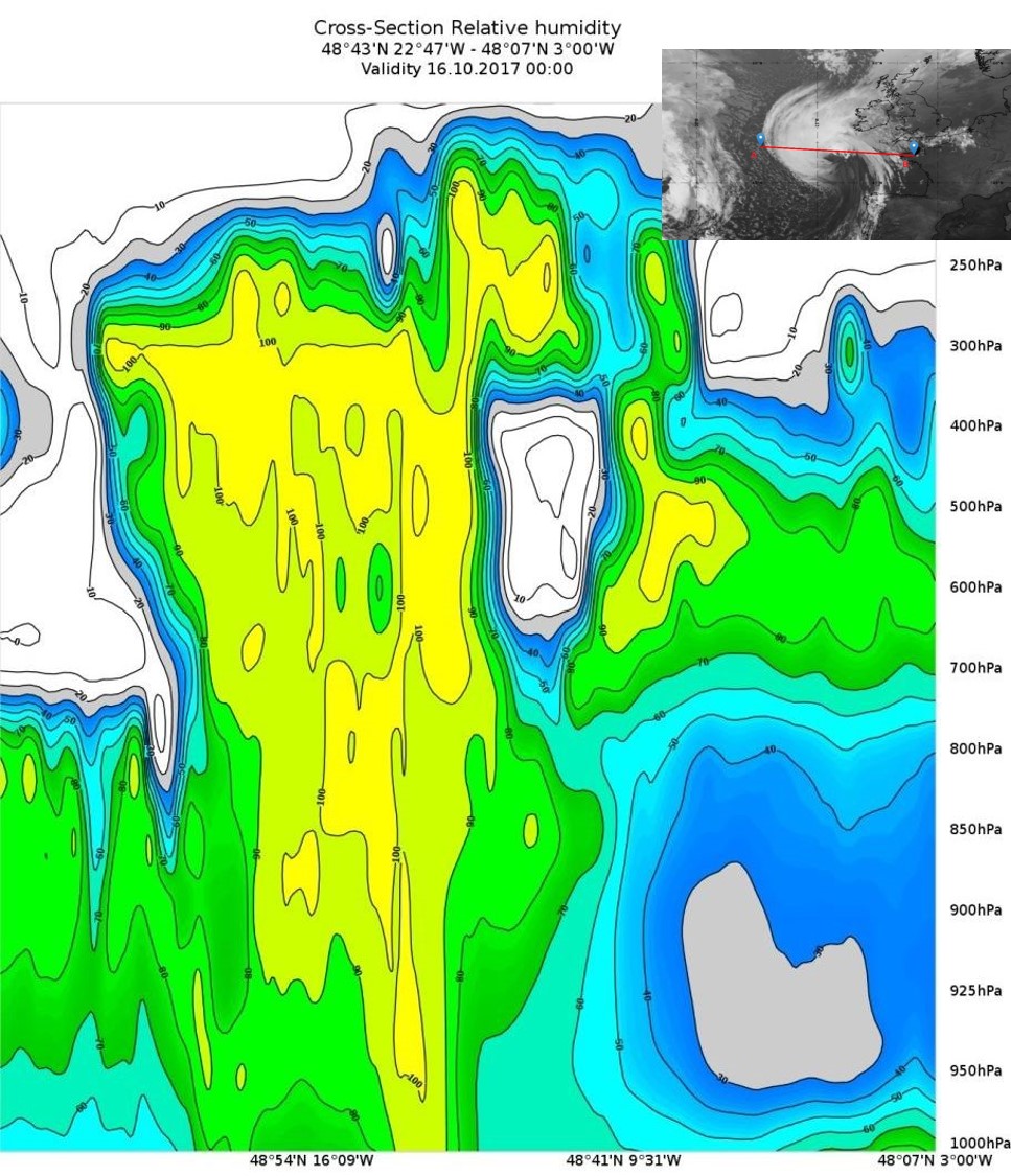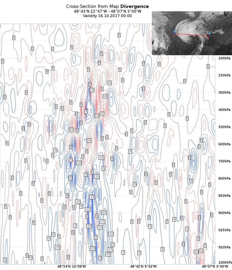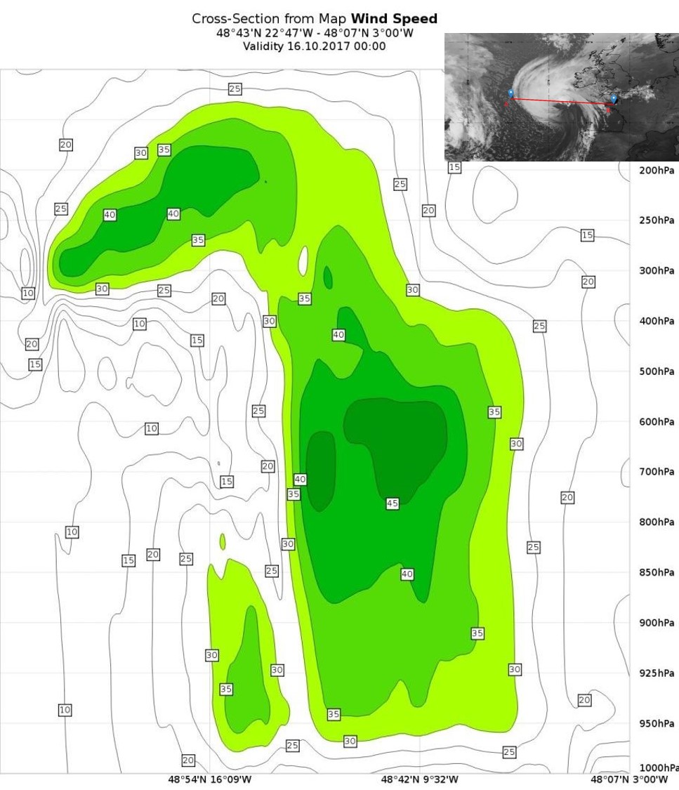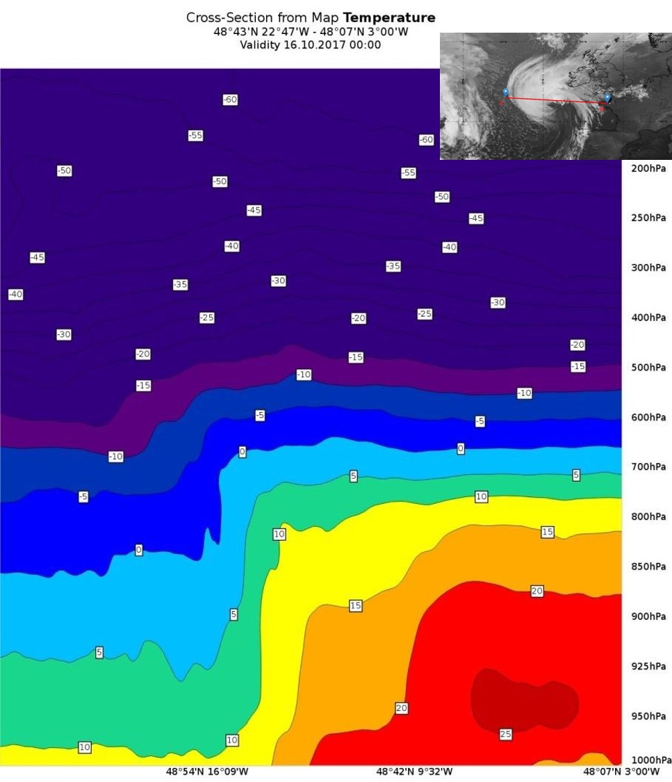 On 16th October, Ophelia was demoted from hurricane to an extratropical storm. A vertical cross section (Figure 27) will help us understand the three-dimensional dynamics of the extratropical cyclone.