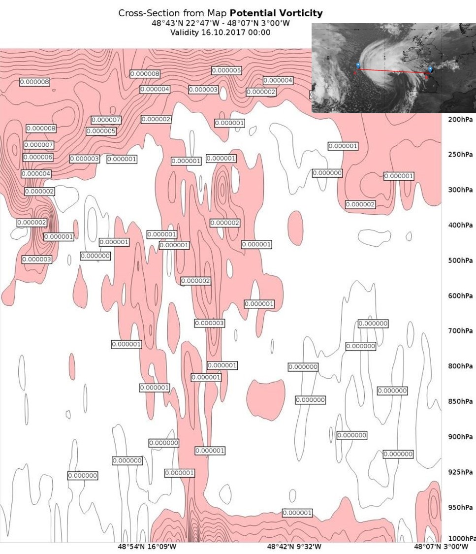 During the lifetime of the storm Ophelia and hurricane Ophelia, we notice the existence of a maximum of PV anomaly over it, but the dark stripe is not so pronounced. It starts to get more pronounced when Ophelia is embedded with the frontal system from the north on 15th October (Figure 26). The lines of PV = 1.5 reaches down to 500 hPa and show a strong gradient in the height of the tropopause. A dry slot in WV imagery (16th October 00:00 UTC) appears as a part of the descending air entering to the southwest of the surface low.