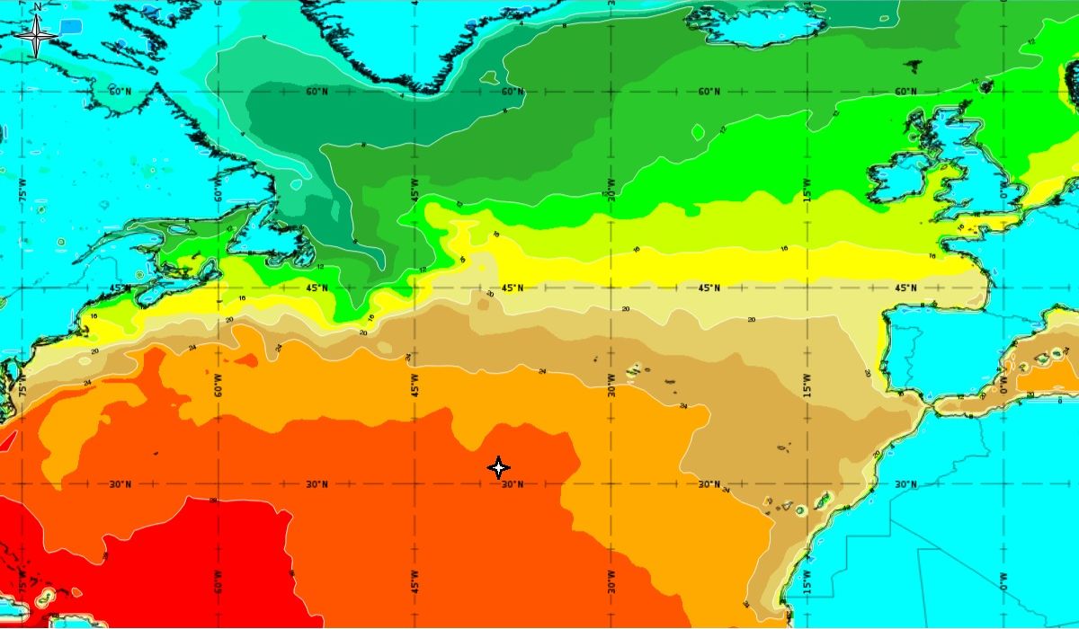Figure 5: 6th October 2017, 12:00 UTC - SST; star - position of low, orange colour - temperature between 26 and 28 °C (ECMWF), source: EUMeTrain, ePort