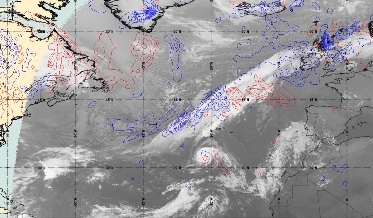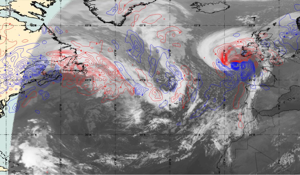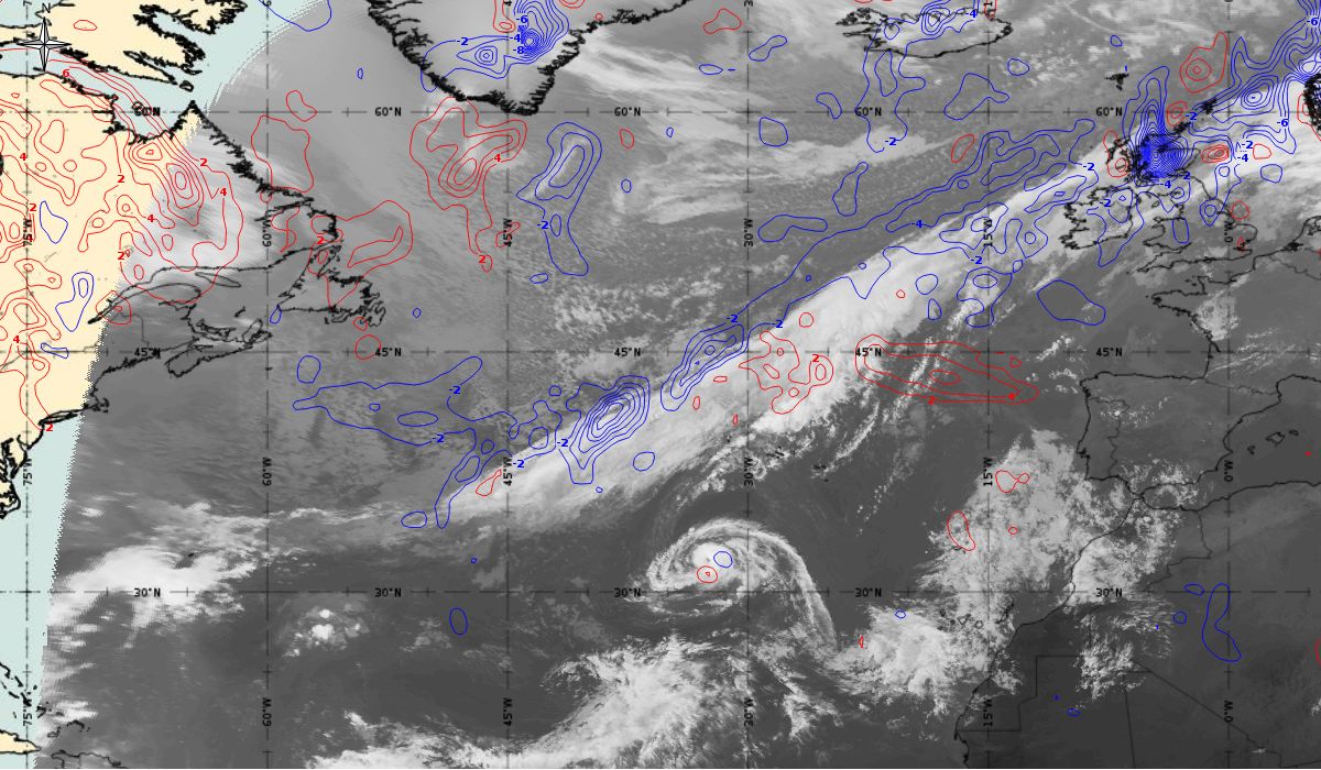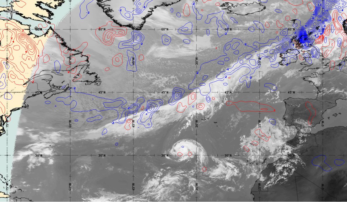 After the passage of the cold front on 6th October, the initial stage of cyclogenesis is seen on Figure 4 as cloud bulges at the rear edge of the aforementioned cold front (31.1 °N, 39.9 °W - in the middle of the Atlantic). While at the same time in the upper level (AT 500 hPa) a deep trough is stretching meridionally (45 °N to 15 °N) between two ridges - one over the West Atlantic and the other over the East Atlantic (west of the Pyrenees Peninsula).