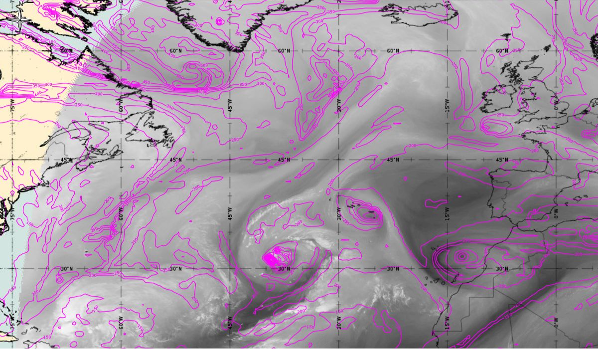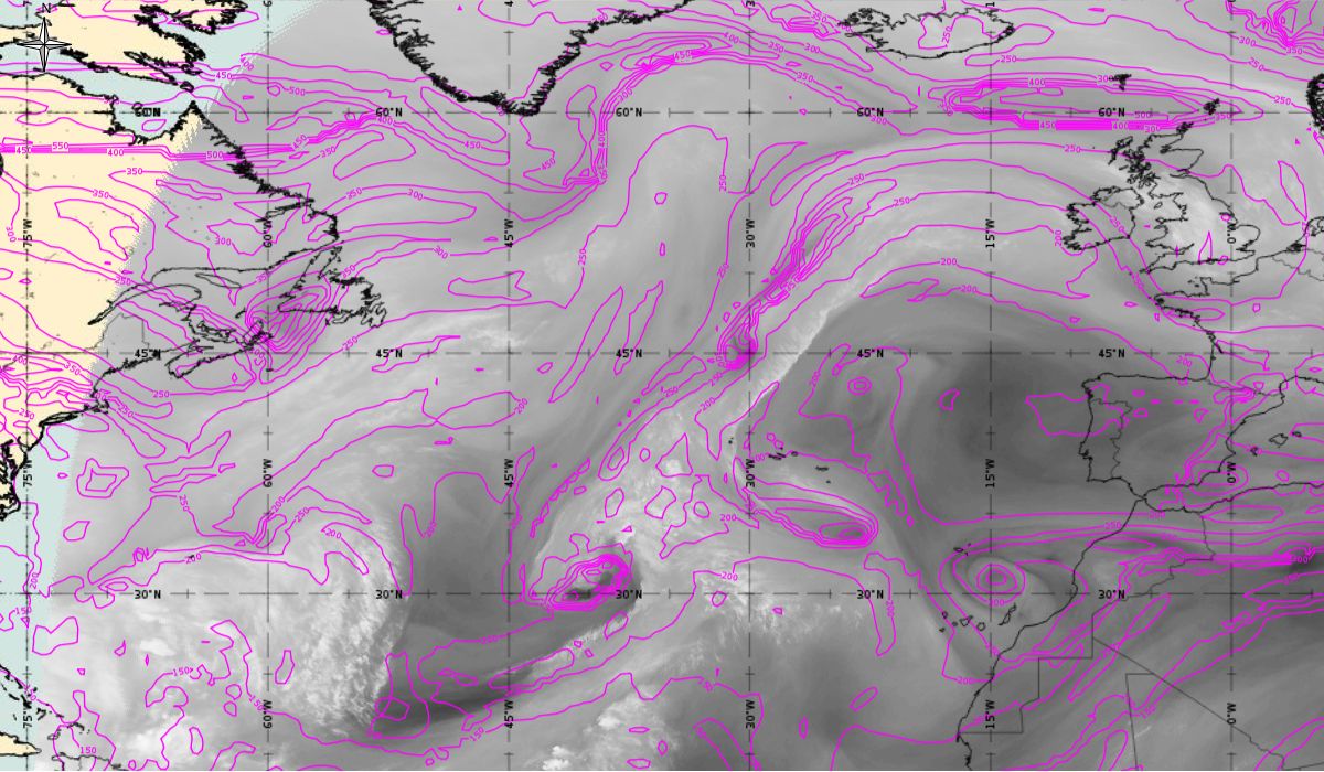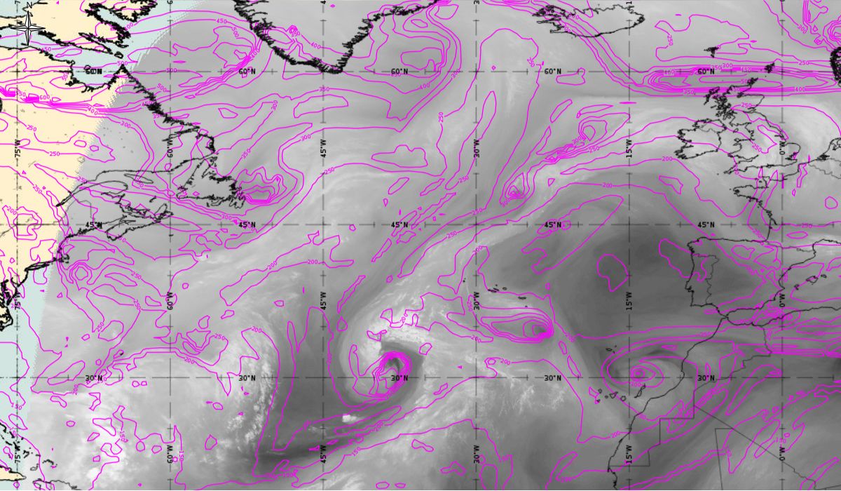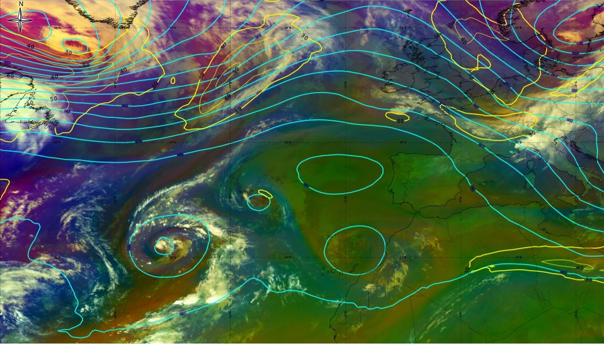 After the passage of the cold front on 6th October, the initial stage of cyclogenesis is seen on Figure 4 as cloud bulges at the rear edge of the aforementioned cold front (31.1 °N, 39.9 °W - in the middle of the Atlantic). While at the same time in the upper level (AT 500 hPa) a deep trough is stretching meridionally (45 °N to 15 °N) between two ridges - one over the West Atlantic and the other over the East Atlantic (west of the Pyrenees Peninsula).