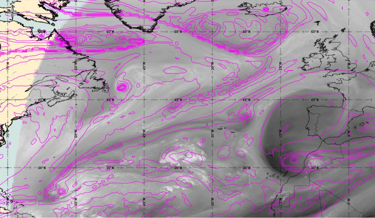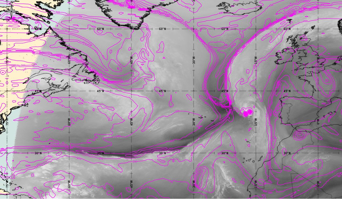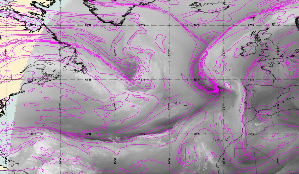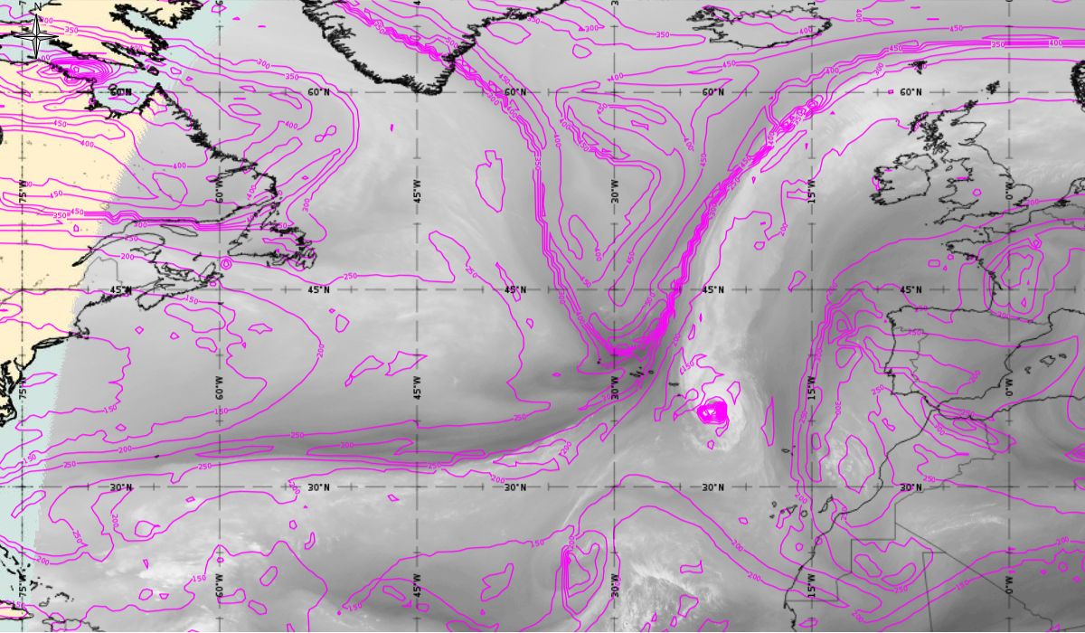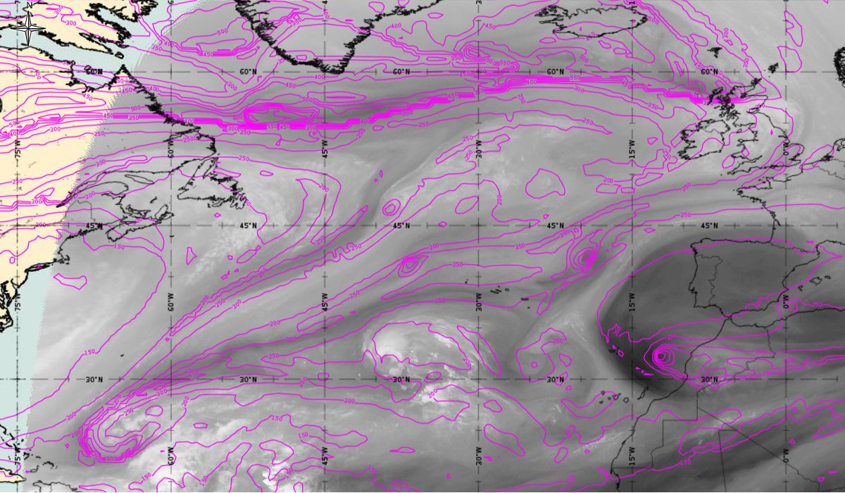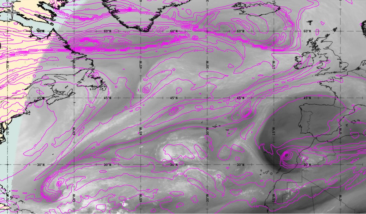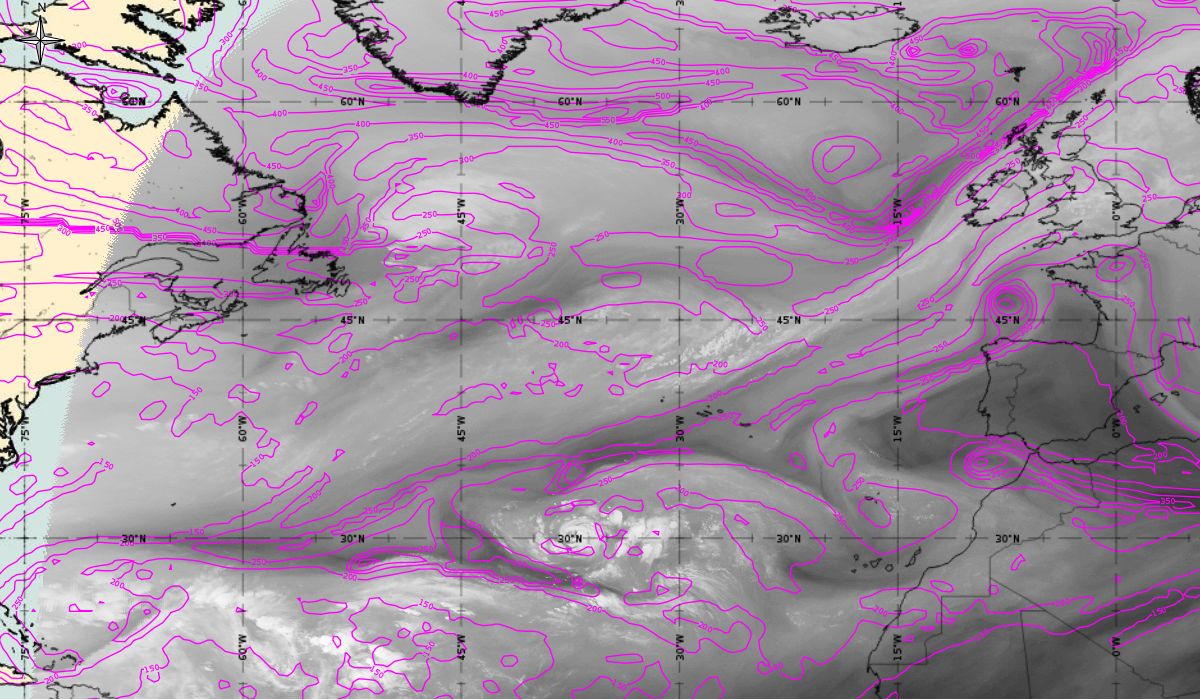 Geopotential height at 500 hPa and Jets at 300 hPa (Airmass RGB)