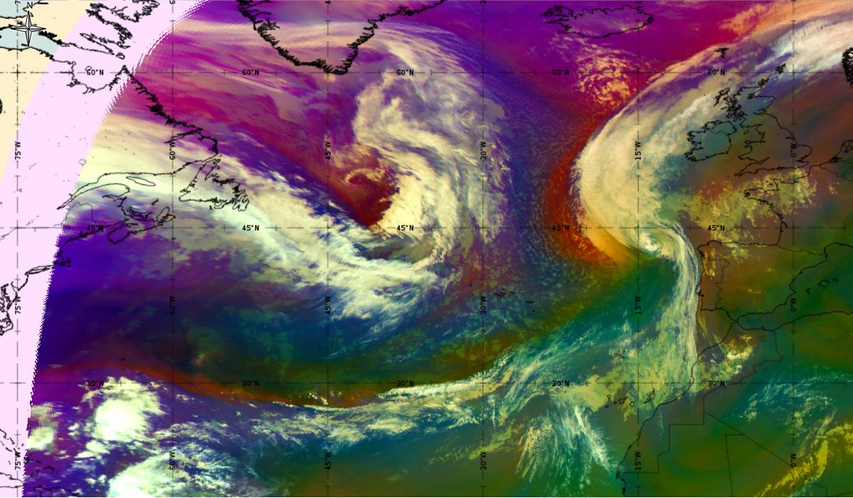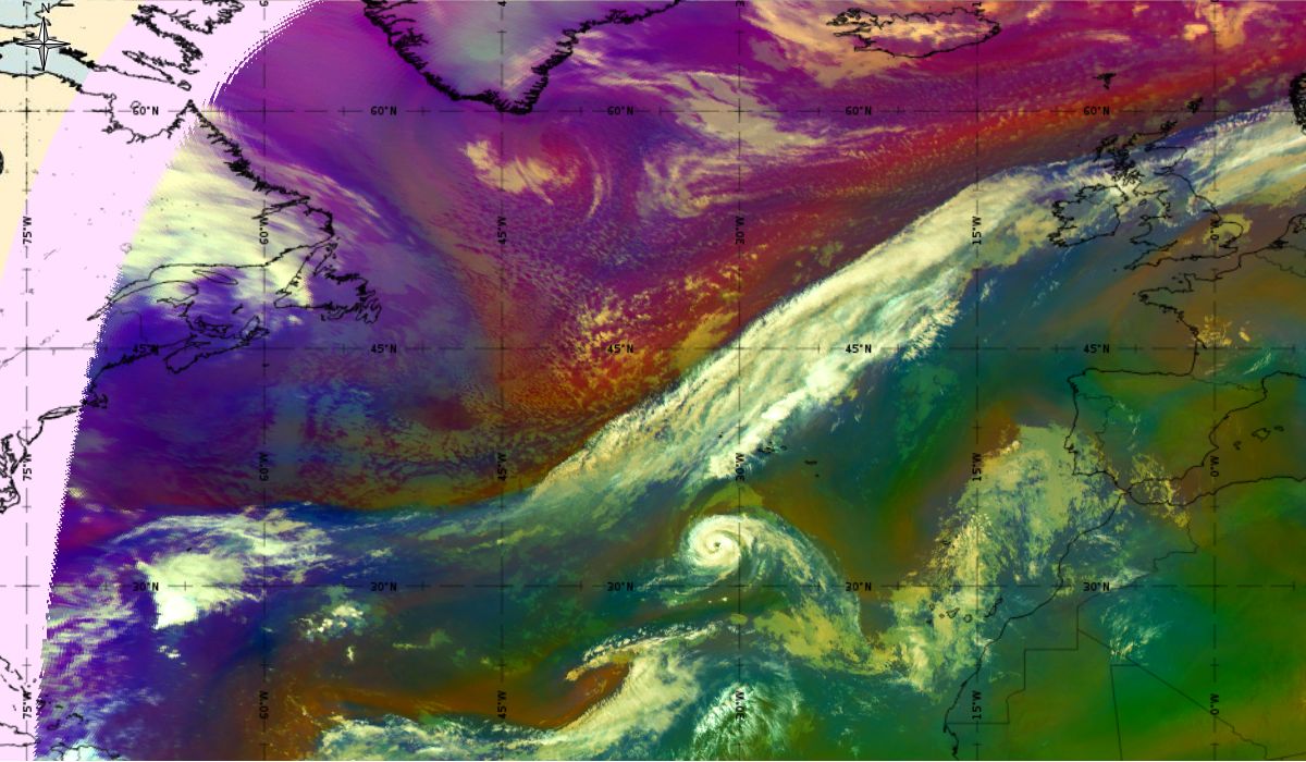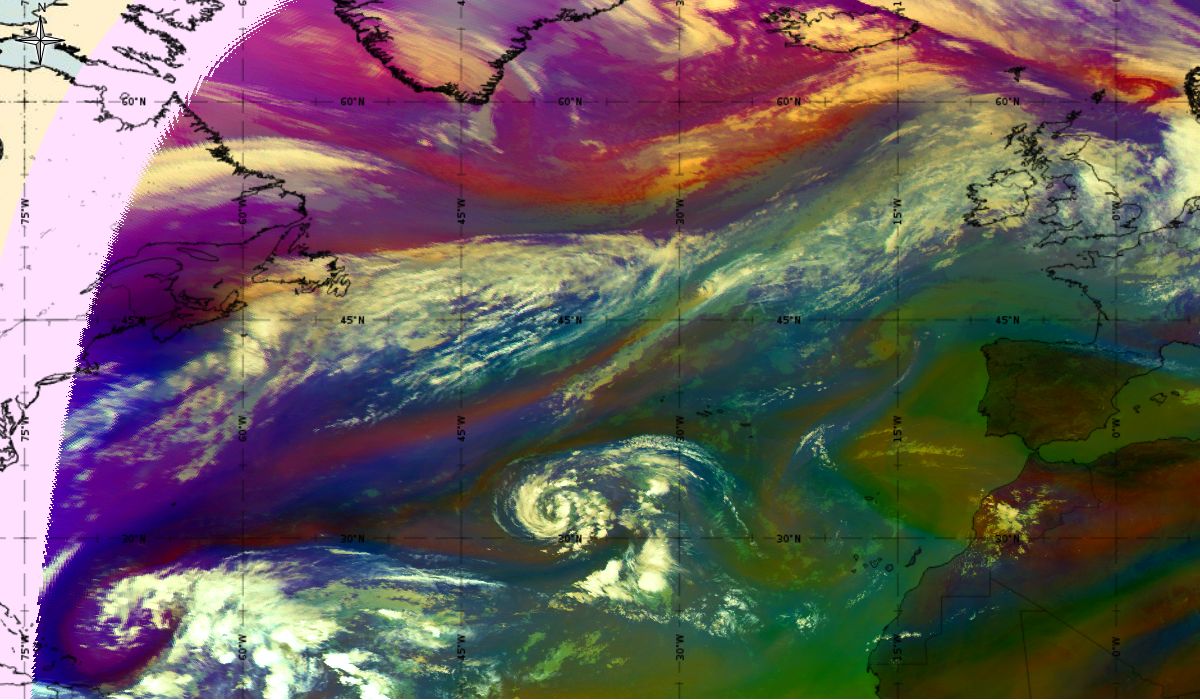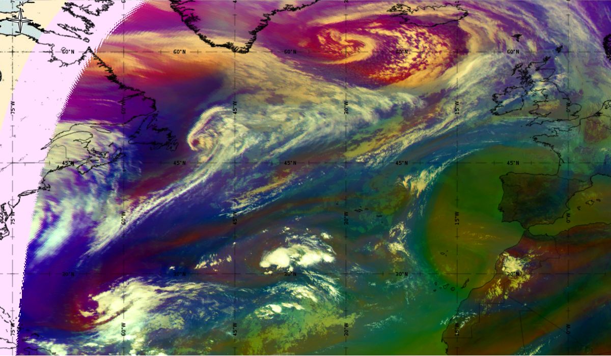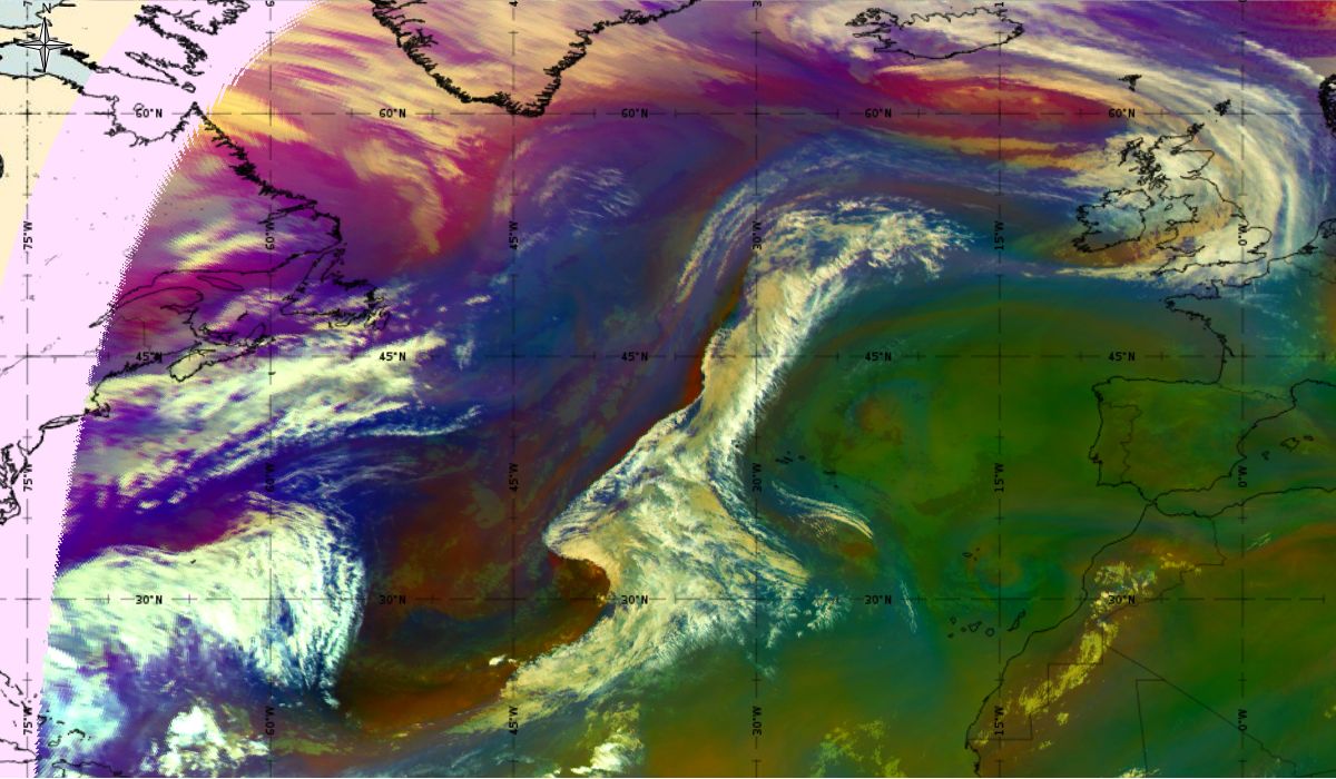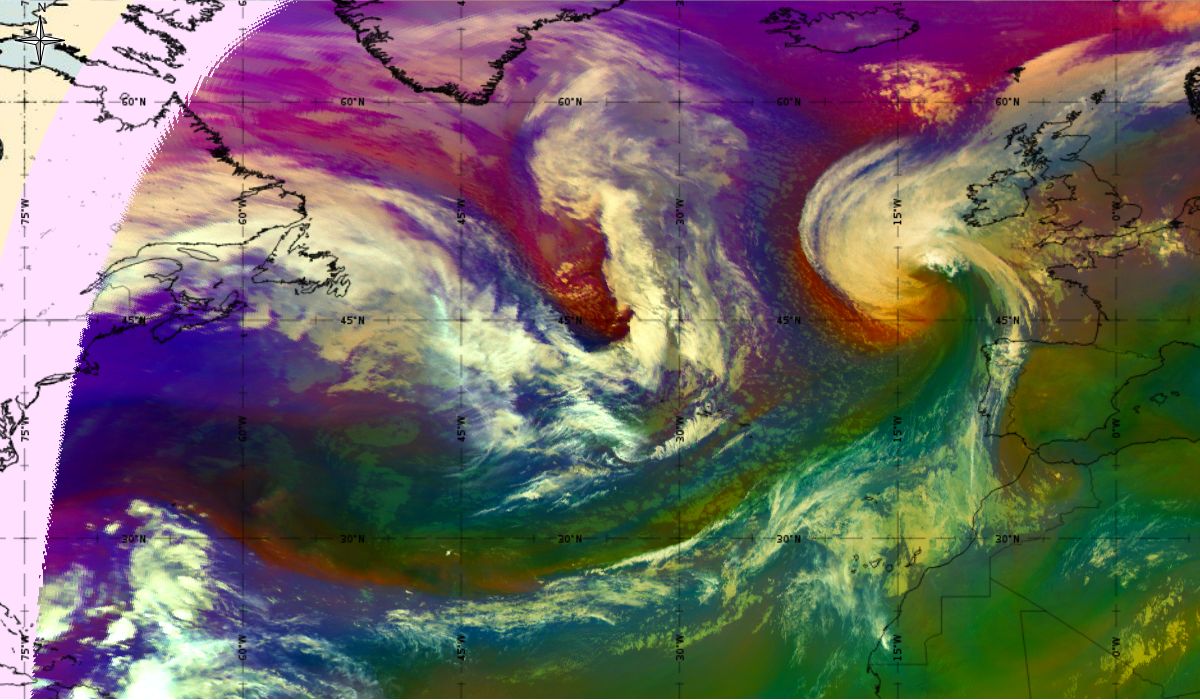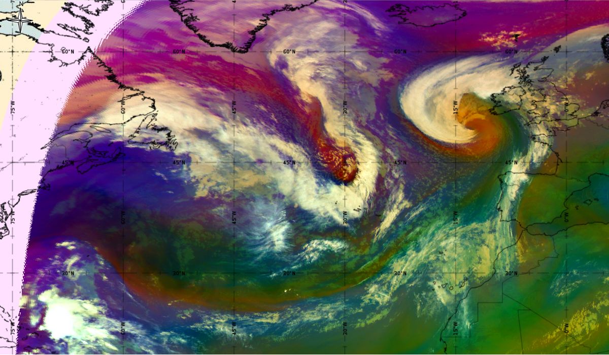 Looking at animations of RGB Airmass satellite images we notice that in the beginning, the frontal cloud band separates into two air masses - warmer over the west Atlantic and colder over the east. The jet axis is along the transition from blue to red colours at the rear side of the cloud band. Dry sinking air appears as red and indicates that cyclogenesis is ongoing. The dry air provides high potential vorticity and is the cause of further development and convection. South of the system, warm tropical air mass is greenish with lower clouds, appear less bright. Thick high-level clouds above the front are bright white.